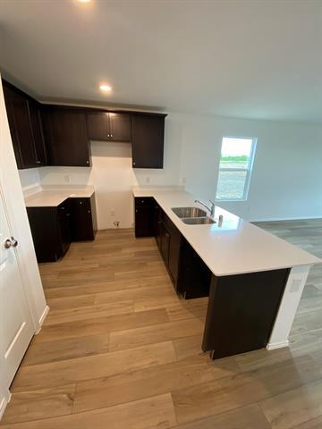 The highly coveted floor plan has an open concept kitchen with an island for storing cooking gadgets, plenty of modern light gray cabinetry and quartz counter top space with a light gray subway tile backsplash and coordinated gray, brown light Rigid Core Polymer plank flooring throughout the entire home. Plush stain resistant carpet in all bedrooms. The kitchen is open to the family room located near the breakfast nook and covered patio for entertaining or relaxing at home with family. Double vanity with quartz countertops in the owner's suite bath and enlarged shower with linen closet.