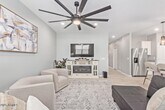 Seize the opportunity to live in this turnkey NEWER FULLY FURNISHED luxury modern farmhouse with veneer accents & a 2-car garage on a perfect corner lot! Inviting hallway leads to the captivating open floor design featuring high ceilings,newer furniture and appliances throughout,trending palette,lovely wood-look flooring,decorative ceiling fans & chic light fixtures,and a freestanding fireplace. RO & soft water system. Remarkable kitchen showcases recessed & pendant lighting,upgraded SS appliances,granite counters,stylish tile backsplash,a pantry,white cabinetry w/crown molding,a pantry,& an island w/breakfast bar. Primary bedroom has plush carpet,a pristine private bathroom w/dual sinks & a sizable walk-in closet.