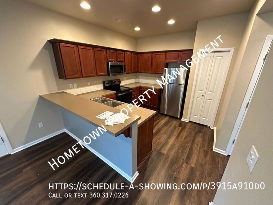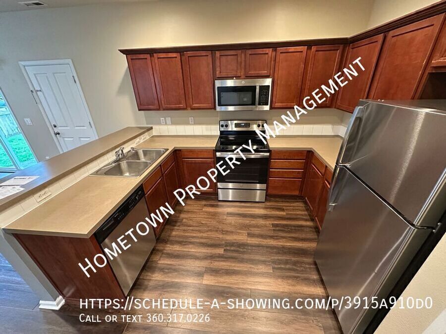 This updated 3-bedroom, 2.5-bathroom home offers a spacious 1,730 sq. ft. of comfortable living space, with a partially enclosed yard and a two-car garage. Inside, the kitchen is equipped with modern appliances, including an electric stove, microwave, dishwasher, and refrigerator — perfect for cooking and entertaining. The home also features washer/dryer hookups for easy laundry access. On cooler nights, relax by the gas fireplace, adding a cozy touch to your living room. The sprinkler system keeps the yard looking great all year long. **NO SMOKING** Small pets negotiable with monthly pet rent of $40 per pet. 12-month minimum lease. Great location, close to parks, shopping, and area amenities. 25 minute commute to JBLM. To schedule a no contact showing, call/text , or use the link below: