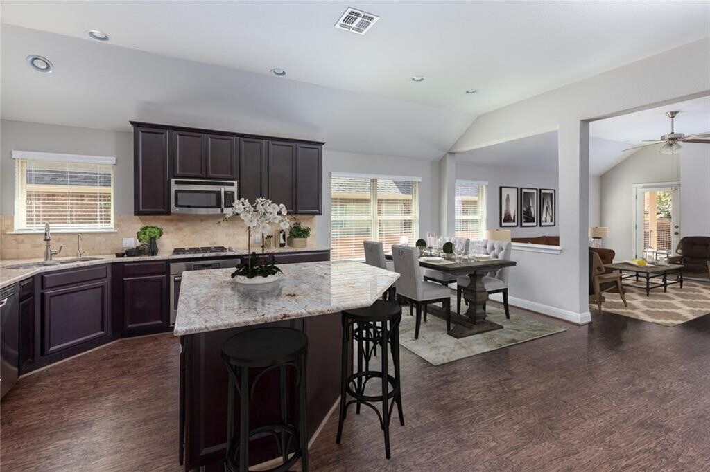 Welcome home to this incredible home with the perfect open floor plan in the sought after neighborhood of Sweetwater. This home offers an upstairs retreat with full bedroom and bathroom that can also be used as the perfect media room or guest suite. Downstairs features 4 bedrooms with a large dedicated office. The large kitchen boasts a center island, providing ample prep space and additional seating for dining. The spacious living area invites comfort with its cozy fireplace and high vaulted ceilings that enhance the feeling of space and light. The layout encourages easy flow from one room to another with gleaming hardwood floors that tie the spaces together. The natural color palette and abundant windows create a bright and airy environment. All bedrooms are spacious with walk in closets and plenty of natural light. The perfectly sized backyard features a cozy porch overlooking a well-maintained lawn and is the perfect spot for relaxation and entertainment. In addition to the large covered porch, the pergola offers a generous dining and seating area. Enjoy the endless amenities of Sweetwater including two resort style pools, incredible amenity center, miles of hiking and trails, a putting green, fitness center, and more! Feeds into the highly credited Lake Travis ISD. READY FOR MOVE IN. Refrigerator, washer, dryer provided. MLS ID 7696042