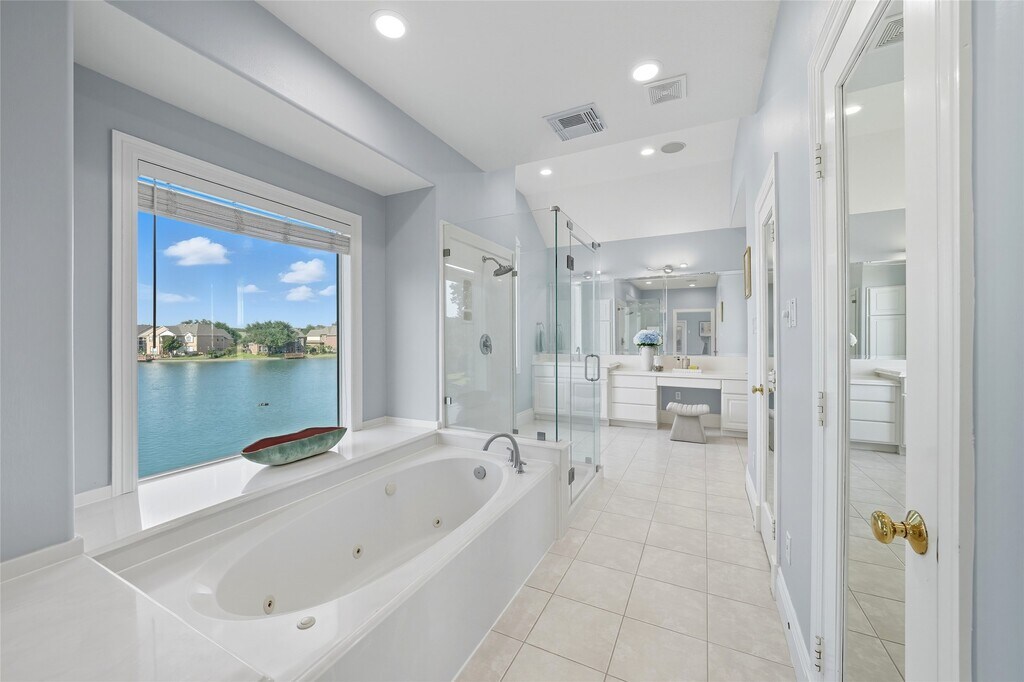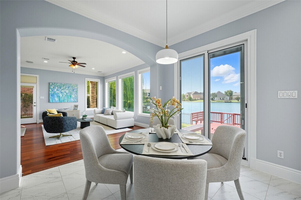 Stunning WATERFRONT HOME in GARDENS OF AVALON! Premier lot with BREATHTAKING LAKE & FOUNTAIN VIEWS. The PRIVATE front COURTYARD & CUSTOM DOUBLE DOORS lead to a TWO-STORY CEILING & cozy fireplace. Sophisticated formal dining. Gourmet island kitchen with quartz counters,backsplash,plus breakfast area,family room—ALL WITH WIDE-OPEN WATER VIEWS. Flexible floor plan includes IN-LAW SUITE and OFFICE down & large game room up. SPACIOUS primary suite offers a PRIVATE BALCONY & updated bath with frameless shower & PANORAMIC LAKE VIEWS. PRIVATE BOAT DOCK,lawn care included in HOA. Never flooded,zoned to AWARD-WINNING SCHOOLS: Commonwealth Elementary,Fort Settlement Middle,and Clements High. Experience the very best of Sugar Land lakefront living! MLS# 96207051