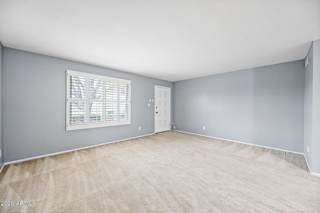 Single level property in Scottsdale's wonderful Villa Solano. Wonderful floor plan. Two Large Bedrooms,plus an open flex room. Formal living and dining for entertaining. Gorgeous open kitchen with kitchen island,stainless steel appliances and quartz countertops. The community offers a pool,work out facility,community room,all close to the airport,and Old Town Scottsdale. Carpet,dual pane windows,large covered patio,and plantation shutters and storage shed. This interior unit is NOT located directly on Thomas Rd. Tour Today!
