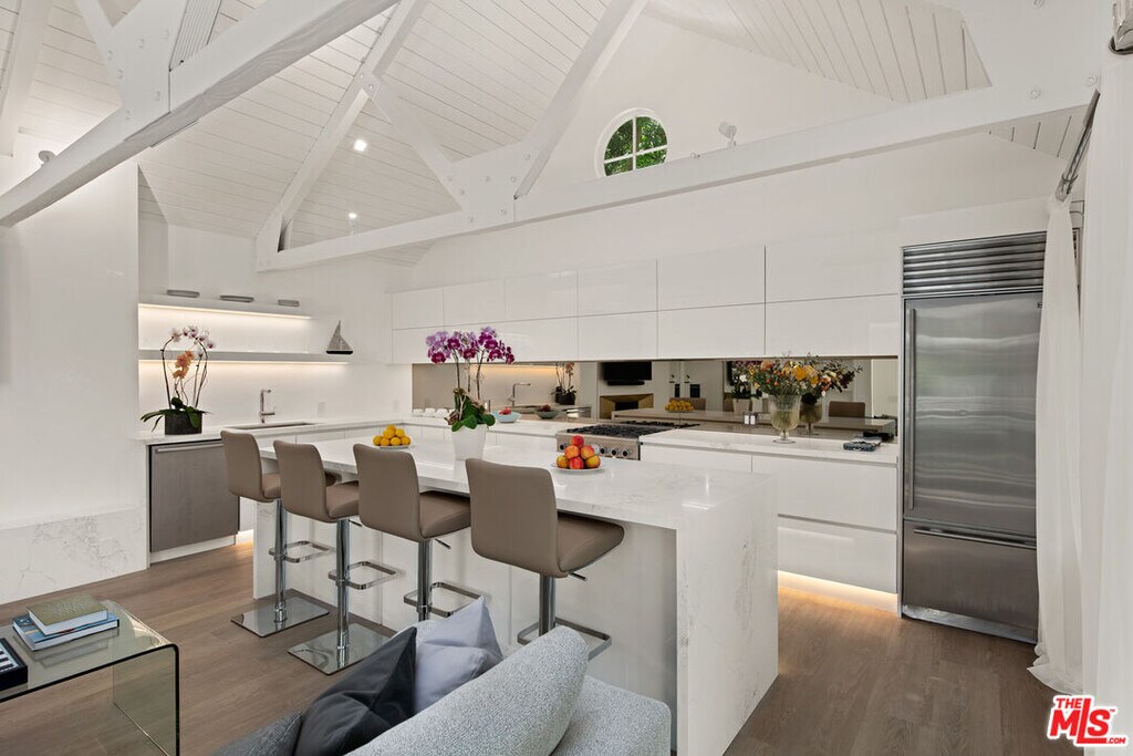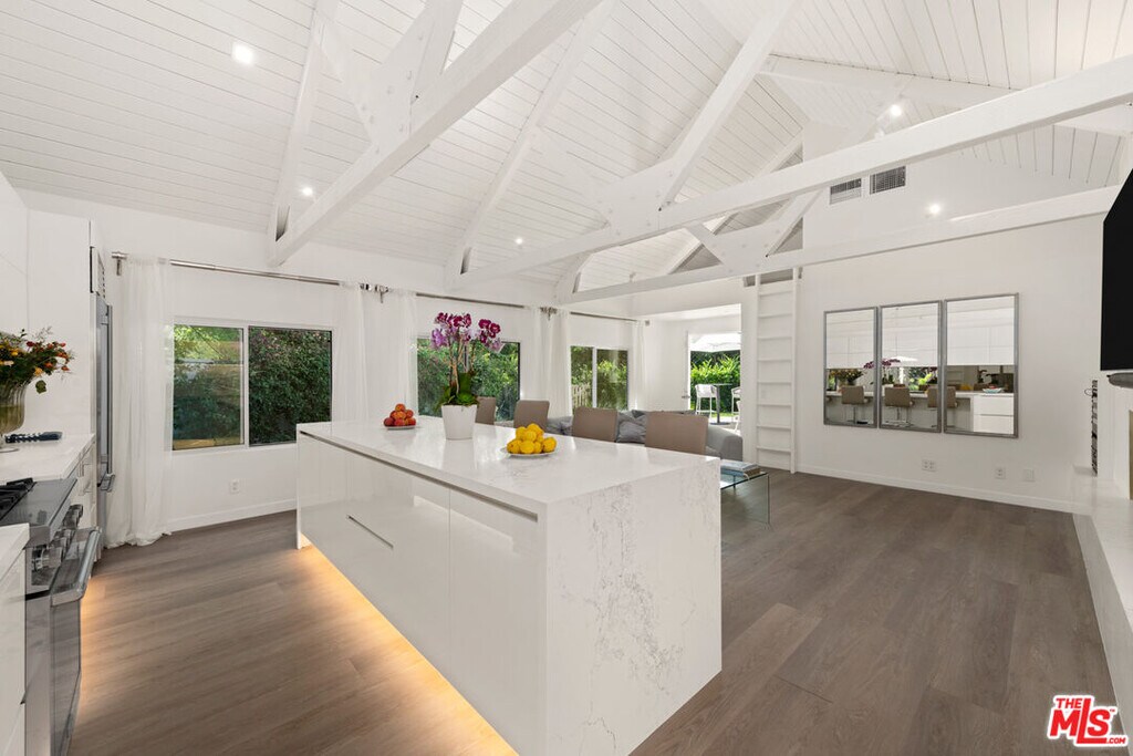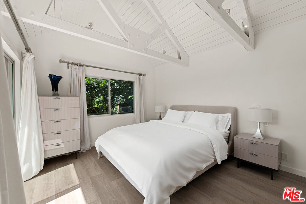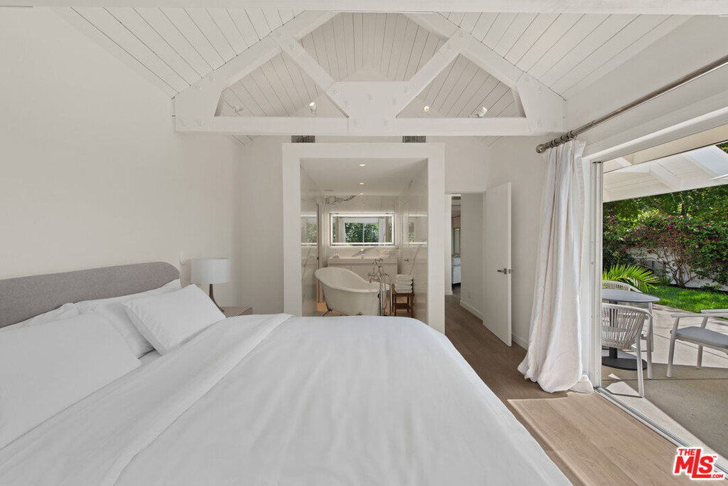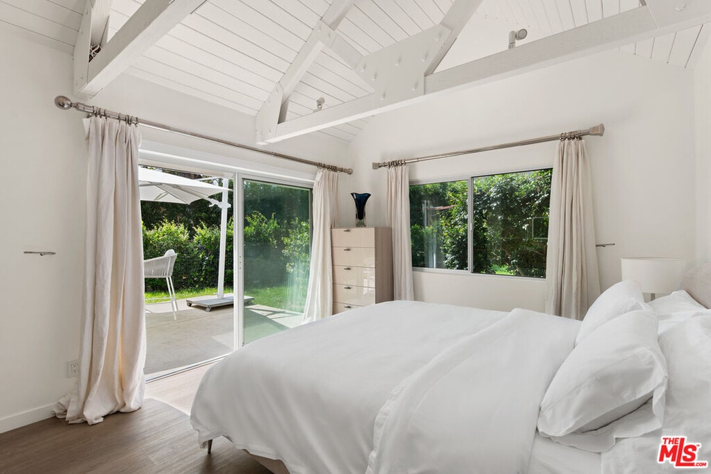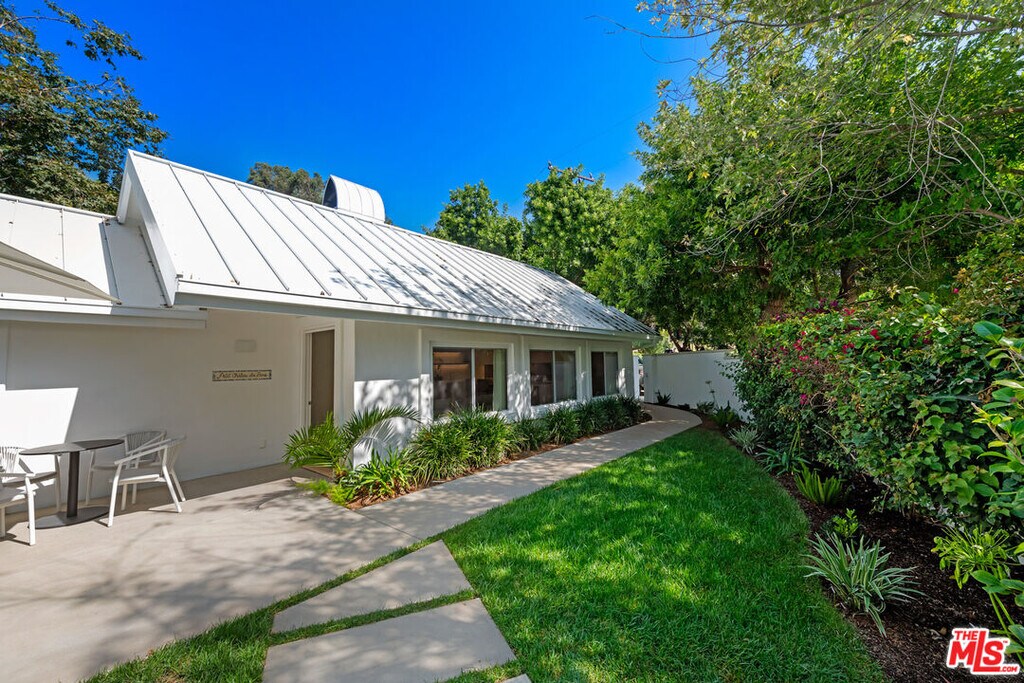 The perfect Malibu getaway, Petit Chateau des Bois is a single-level garden guesthouse with bright, spacious interiors updated for superb comfort and relaxed indoor-outdoor living and entertaining. Gated and very private, life at the chateau revolves around a large, open great room with vaulted, trussed ceilings, fireplace, wood floors, ample seating, and a storage loft. This lovely space, with multiple sets of garden-facing windows, adjoins the beautifully updated kitchen, which has a waterfall-style island with bar seating, dramatic under-cabinet lighting, abundant storage space, and top-quality appliances. The all-marble spa-style bath is immaculate and charming, with a freestanding tub. The bedroom has high, trussed ceilings and wide sliding glass doors that open to a wraparound patio and lawn for relaxing, dining, and entertaining. The property is equipped with air conditioning, DoorBird system, parking, and a backyard shed with laundry and storage space. An occasional creek sits on the property line. This is an ideal escape, close to Point Dume, beaches, and miles of trails for hiking and riding. MLS# 25567767