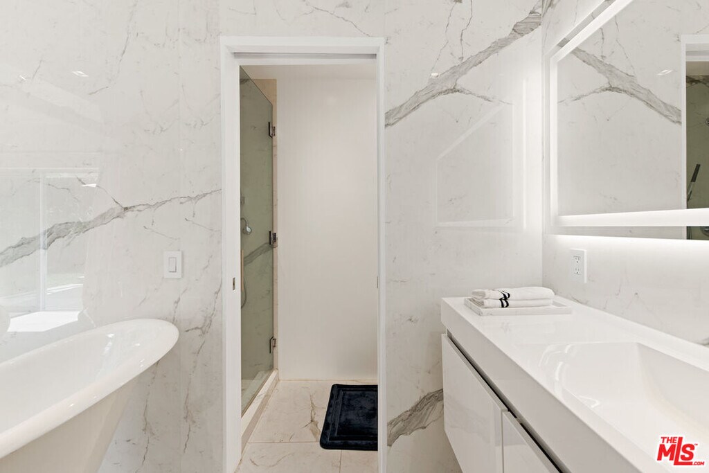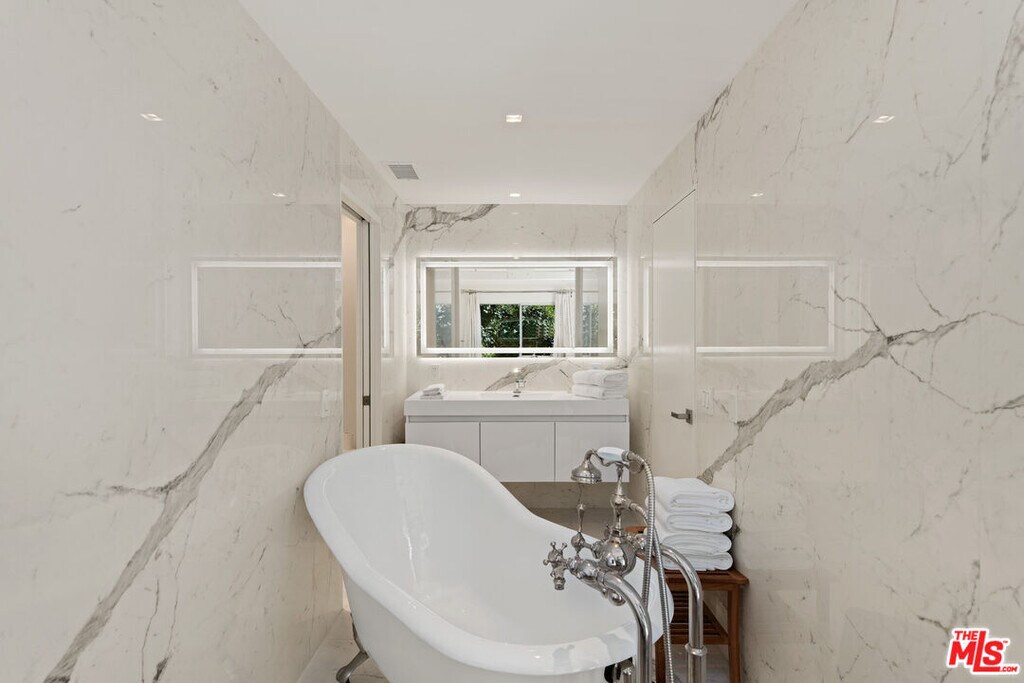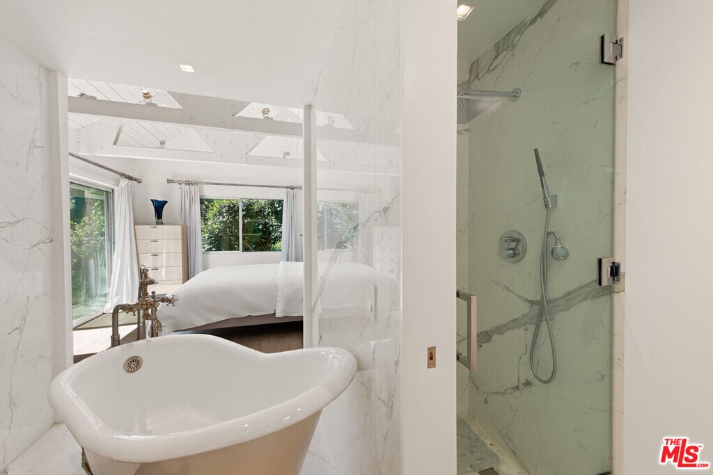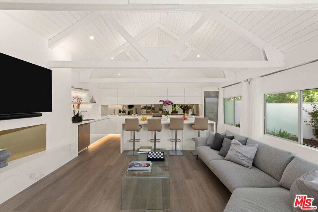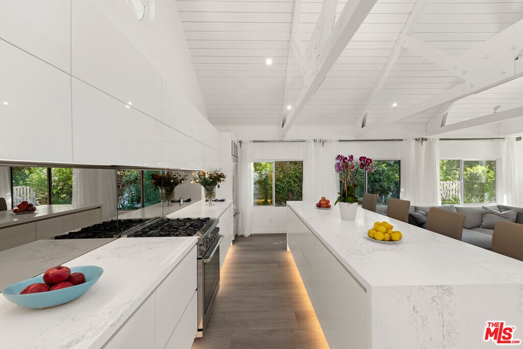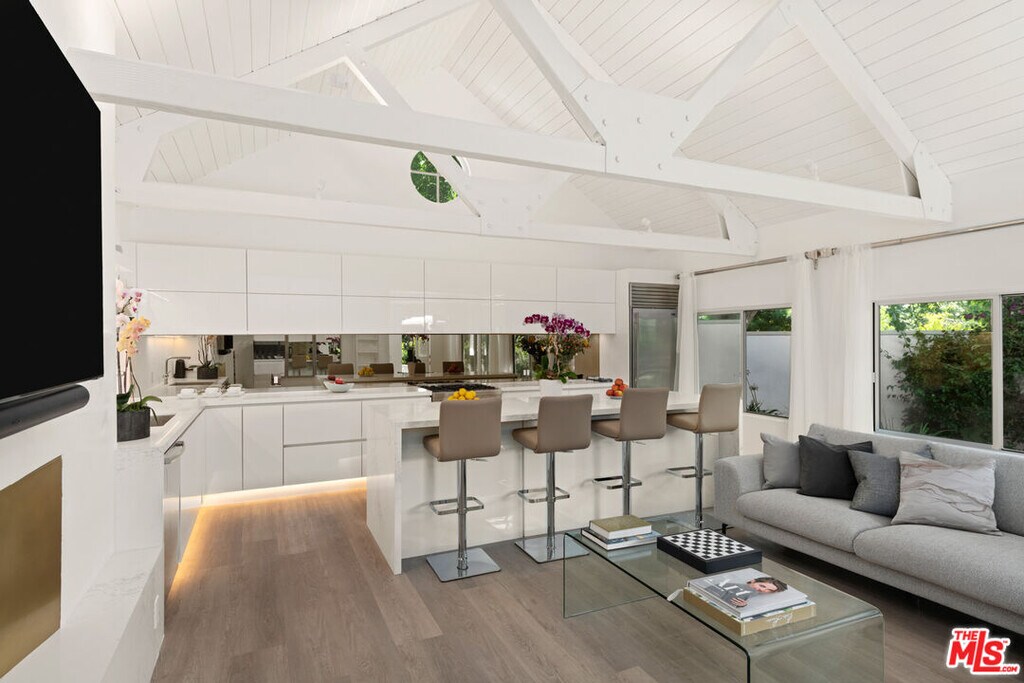 The perfect Malibu getaway, Petit Chateau des Bois is a single-level garden guesthouse with bright, spacious interiors updated for superb comfort and relaxed indoor-outdoor living and entertaining. Gated and very private, life at the chateau revolves around a large, open great room with vaulted, trussed ceilings, fireplace, wood floors, ample seating, and a storage loft. This lovely space, with multiple sets of garden-facing windows, adjoins the beautifully updated kitchen, which has a waterfall-style island with bar seating, dramatic under-cabinet lighting, abundant storage space, and top-quality appliances. The all-marble spa-style bath is immaculate and charming, with a freestanding tub. The bedroom has high, trussed ceilings and wide sliding glass doors that open to a wraparound patio and lawn for relaxing, dining, and entertaining. The property is equipped with air conditioning, DoorBird system, parking, and a backyard shed with laundry and storage space. An occasional creek sits on the property line. This is an ideal escape, close to Point Dume, beaches, and miles of trails for hiking and riding. MLS# 25567767