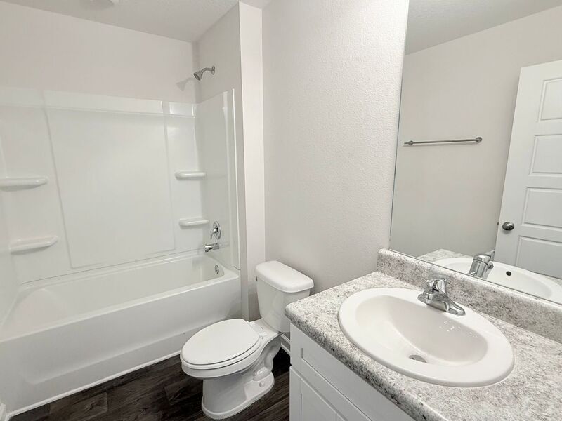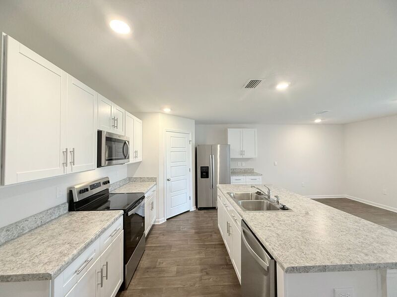 View In 3D: This 4 Bed/2 Bath property features over 1,800 square feet of comfortable living space with durable luxury vinyl plank flooring throughout the main areas, and plush carpeting in all bedrooms. The spacious, open-concept kitchen offers an abundance of counter space, a generous island with bar seating, and stainless steel appliances, including a double door refrigerator, flat top range/oven, built-in microwave, and a dishwasher. The primary suite includes a ceiling fan, walk-in closet, and an ensuite bathroom with private water closet, standing shower and double vanity. Three additional bedrooms share a second full bath with tub/shower combo. Additional highlights include a 2-car garage, stainless steel appliances, a covered back porch area, and a fully-fenced backyard.