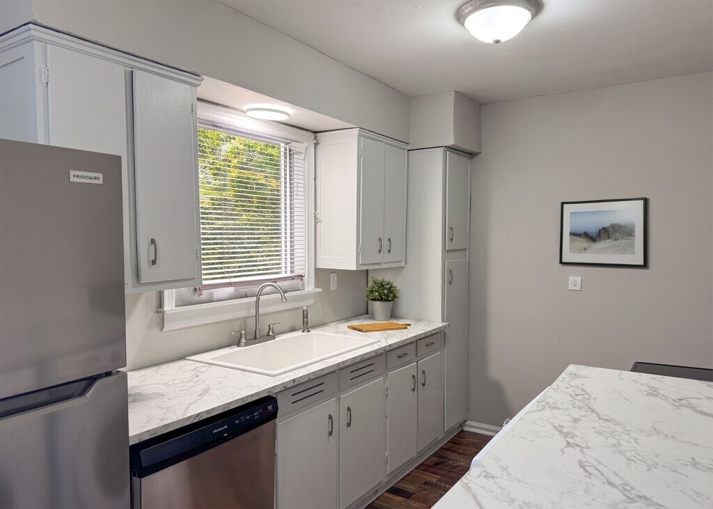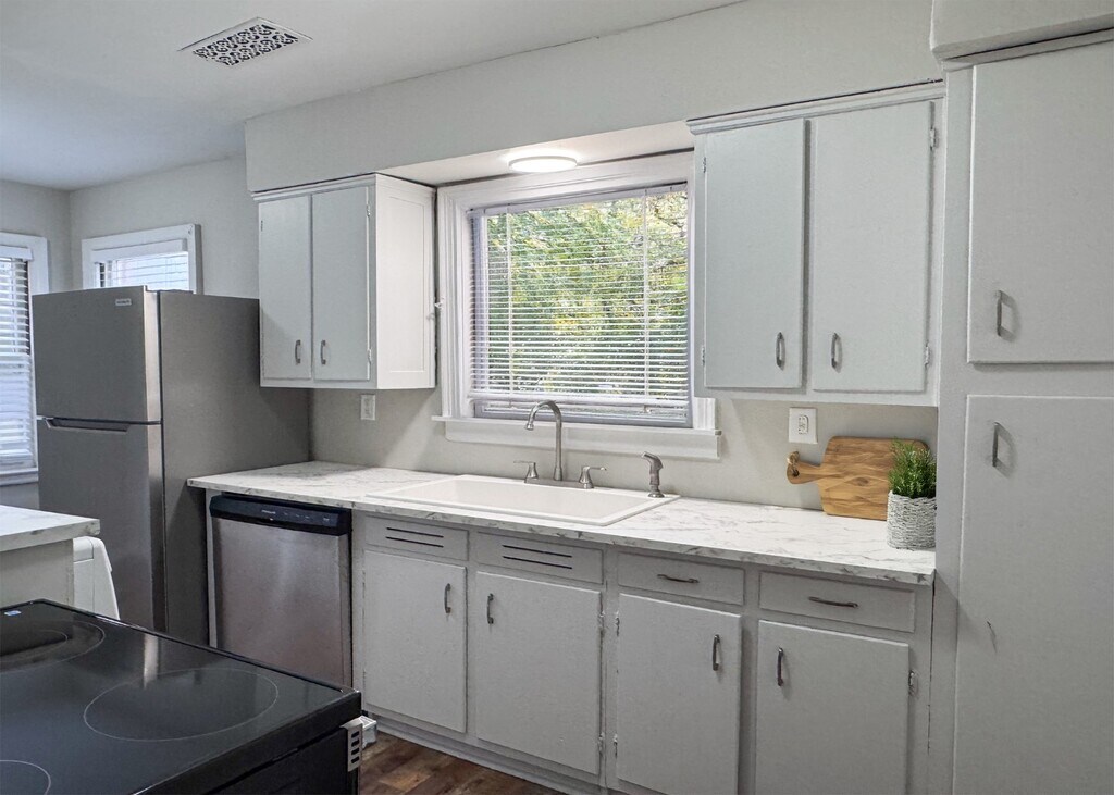 Discover charming Midtown living in this beautifully updated 2-bedroom, 1-bath brick home featuring bright natural light, hardwood floors, and a spacious living and dining area. The updated kitchen offers modern countertops, stainless steel appliances, refrigerator, and dishwasher, with the added convenience of in-home laundry. Enjoy a large fully fenced backyard with mature trees—perfect for relaxing, pets, or entertaining—plus private off-street parking, air conditioning, ceiling fans, and ample storage. Located in a quiet residential area close to Midtown shopping, dining, and everyday conveniences, this home offers comfort, privacy, and space in a great Memphis location.