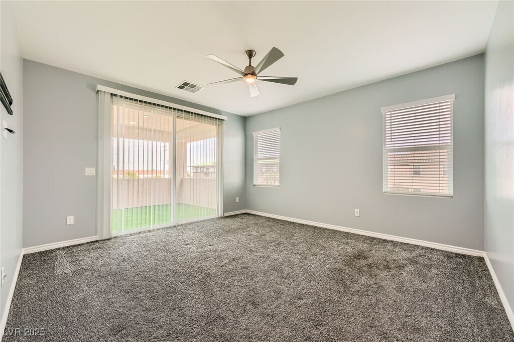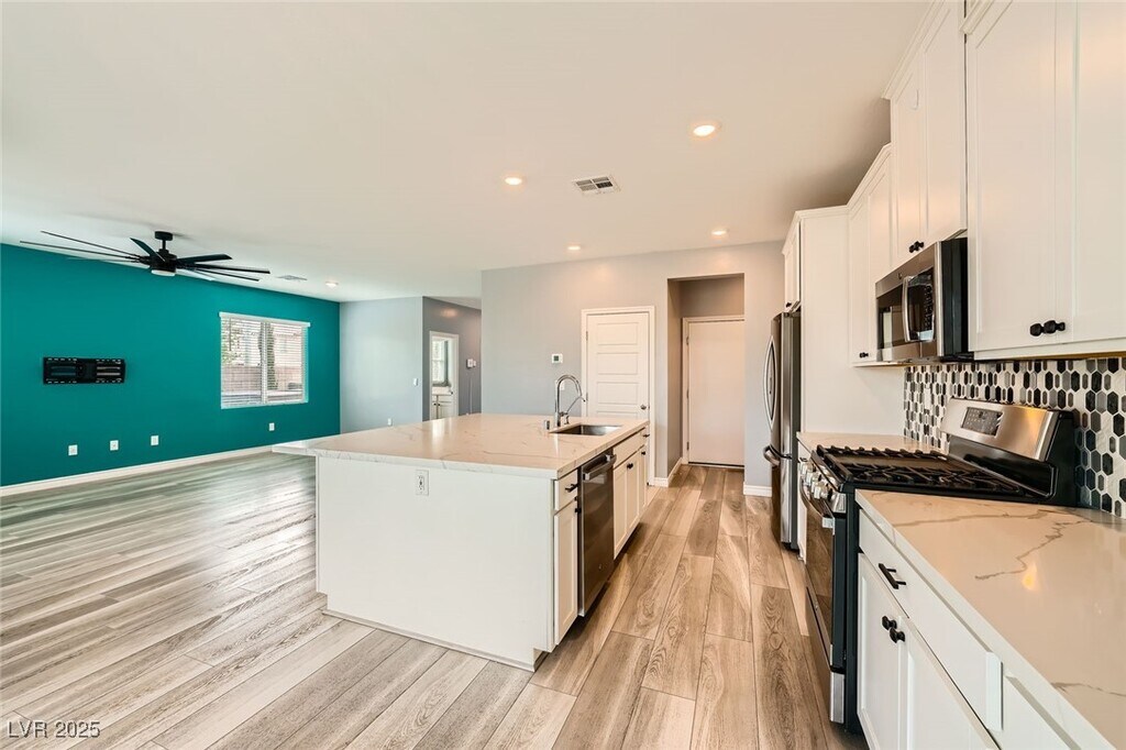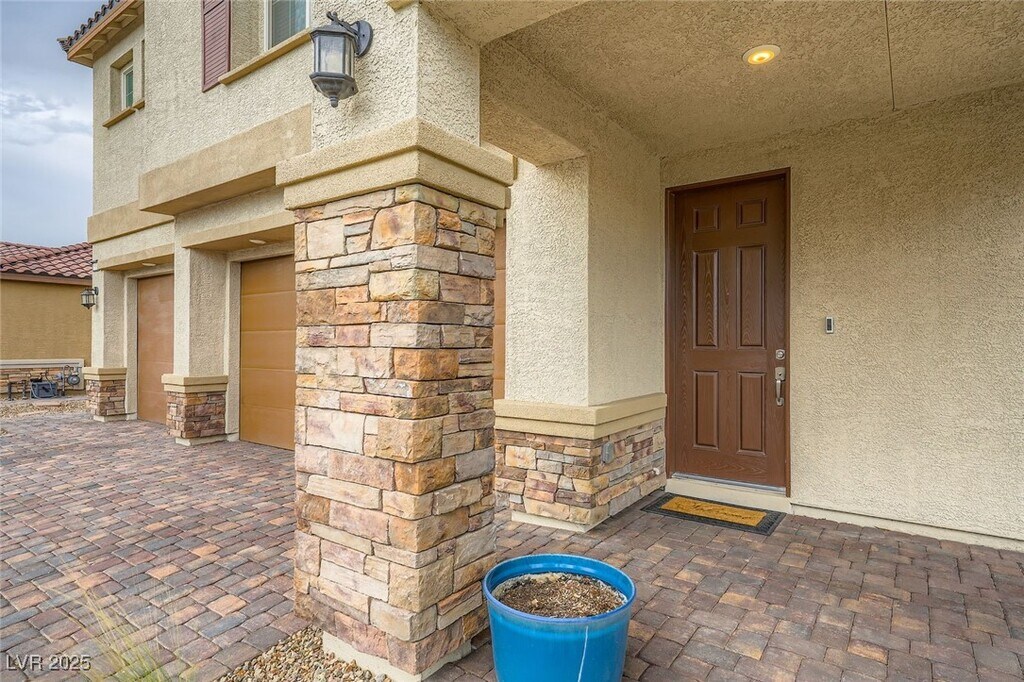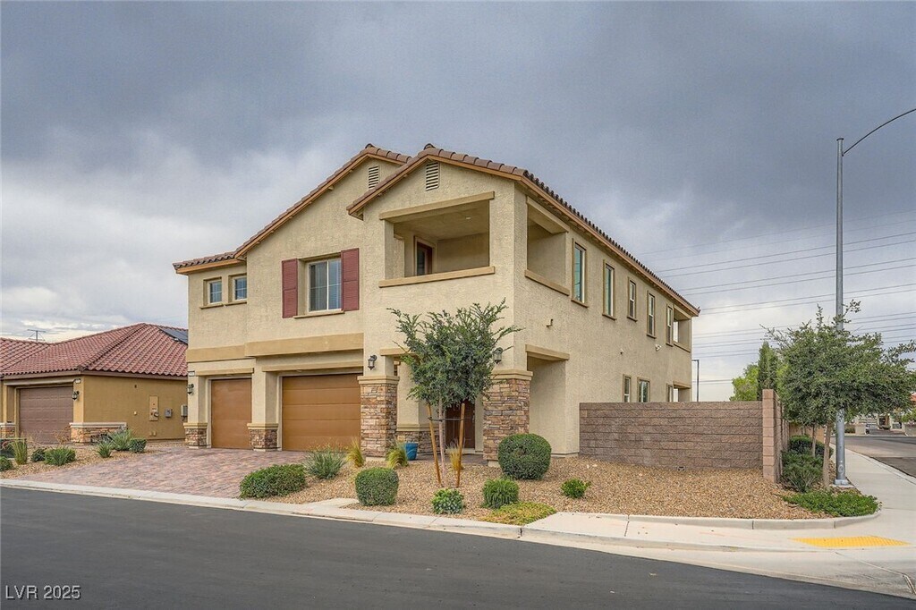 This upgraded 5-bedroom, 4.5-bathroom home offers spacious, flexible living with a rare 3 en-suite layout, including a private downstairs suite complete with its own entrance, kitchenette, living area, laundry, and ¾ bath, ideal for guests or multi-gen living. The open-concept main level features a gourmet kitchen with stainless steel appliances, quartz countertops, island, breakfast bar, and designer backsplash, flowing seamlessly into the dining and living areas. Upstairs includes a versatile loft and a luxurious primary suite with balcony, dual sinks, soaking tub, walk-in shower, and large closet. A 3rd en-suite bedroom with full bath and walk-in closet is also upstairs. The private backyard is designed for relaxation and entertainment with a heated PebbleTec pool, spa, waterfall, firepit, artificial turf, dog run, and covered patio. Situated on a corner lot with no rear neighbors, the home also features a 3-car garage, EV charging, solar power, and partial Strip and city views.