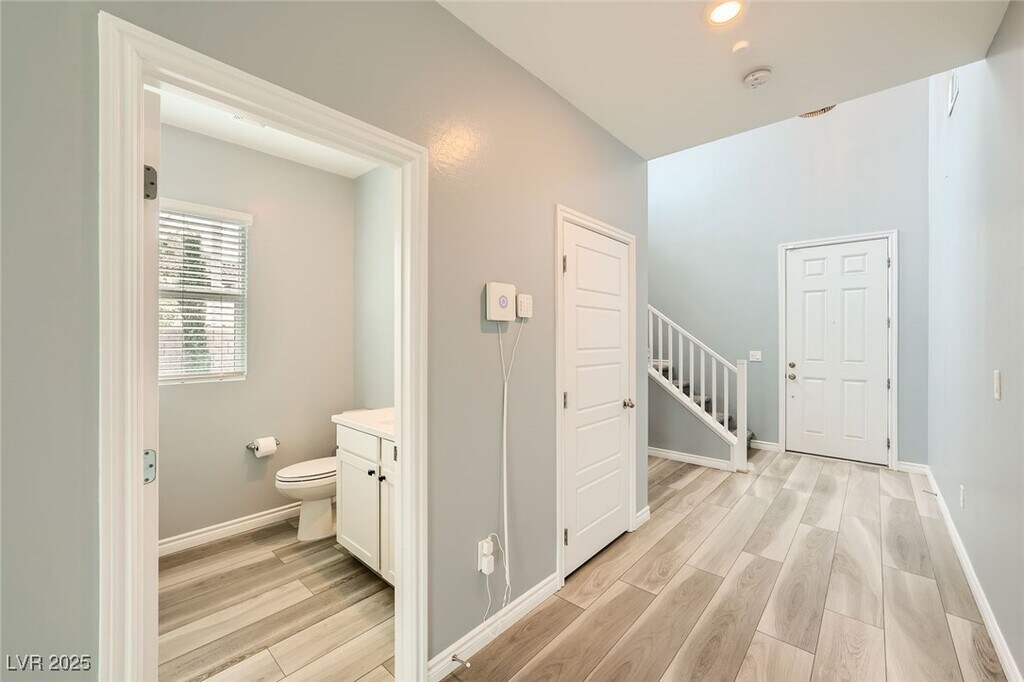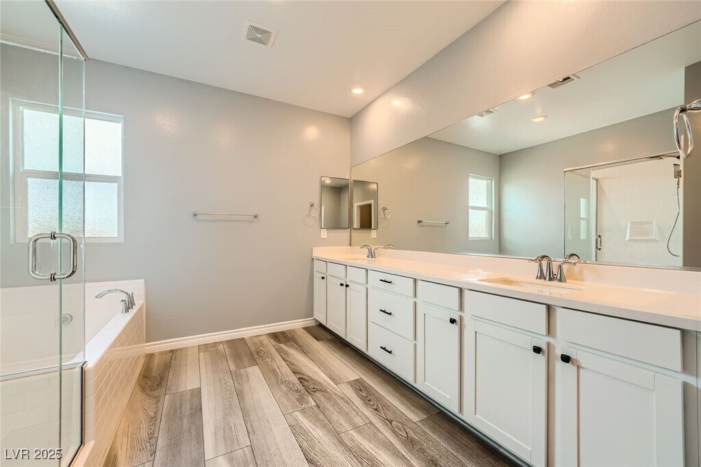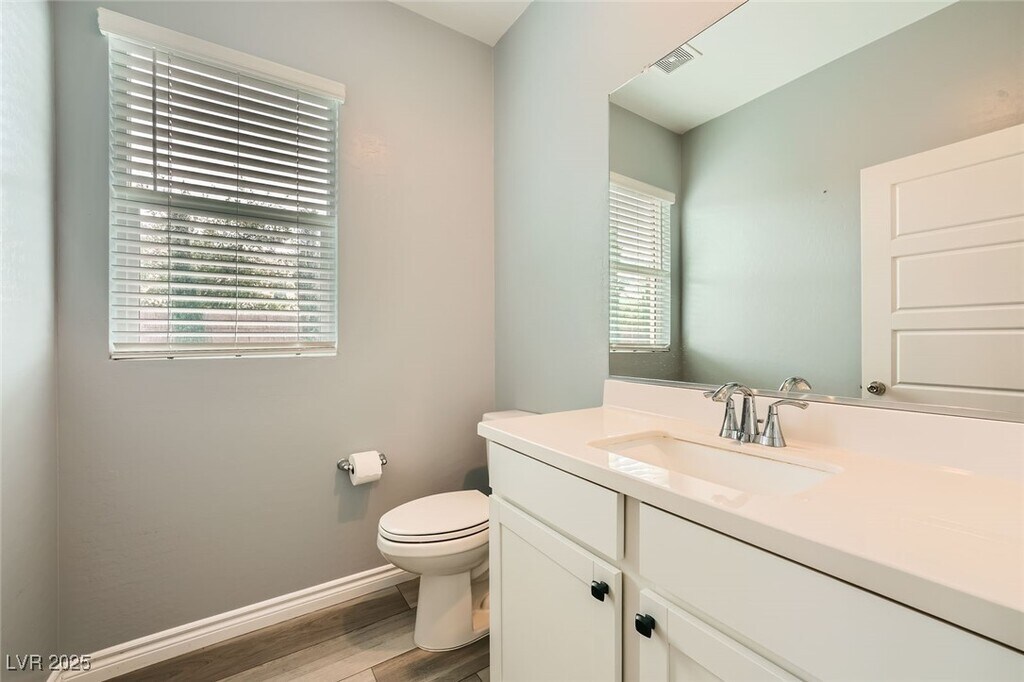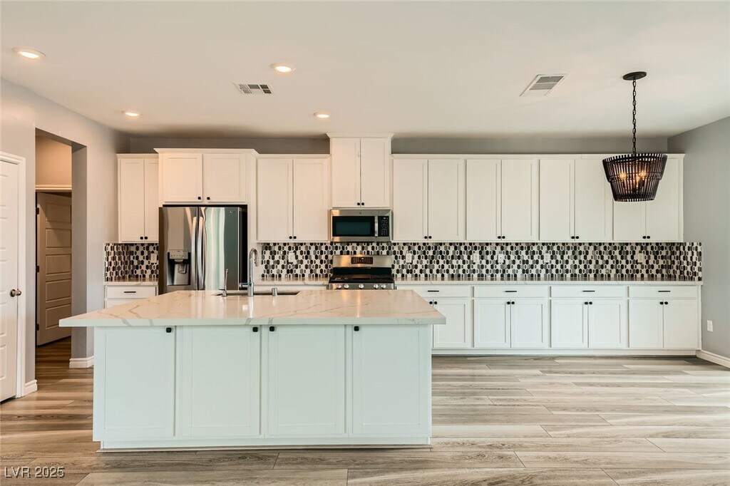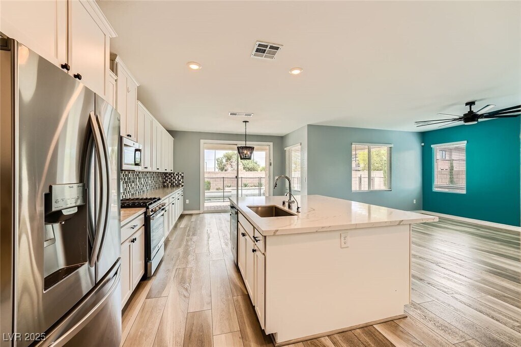 This upgraded 5-bedroom, 4.5-bathroom home offers spacious, flexible living with a rare 3 en-suite layout, including a private downstairs suite complete with its own entrance, kitchenette, living area, laundry, and ¾ bath, ideal for guests or multi-gen living. The open-concept main level features a gourmet kitchen with stainless steel appliances, quartz countertops, island, breakfast bar, and designer backsplash, flowing seamlessly into the dining and living areas. Upstairs includes a versatile loft and a luxurious primary suite with balcony, dual sinks, soaking tub, walk-in shower, and large closet. A 3rd en-suite bedroom with full bath and walk-in closet is also upstairs. The private backyard is designed for relaxation and entertainment with a heated PebbleTec pool, spa, waterfall, firepit, artificial turf, dog run, and covered patio. Situated on a corner lot with no rear neighbors, the home also features a 3-car garage, EV charging, solar power, and partial Strip and city views.