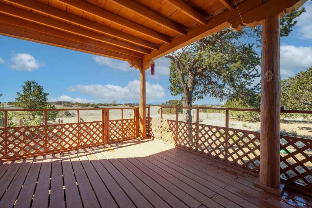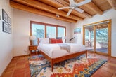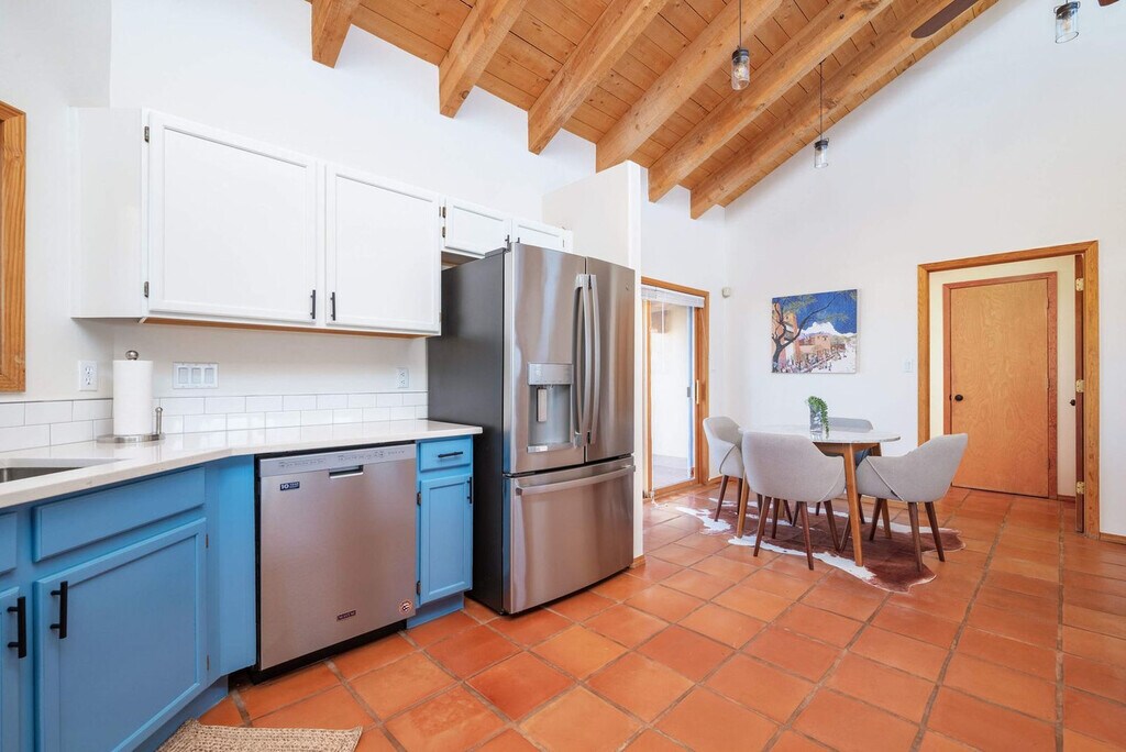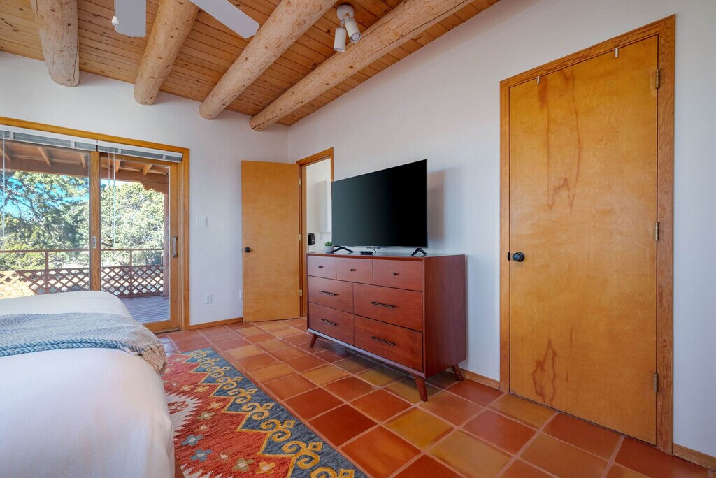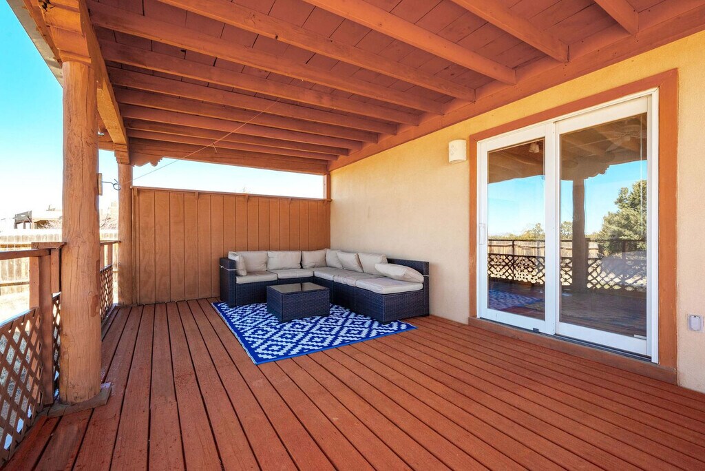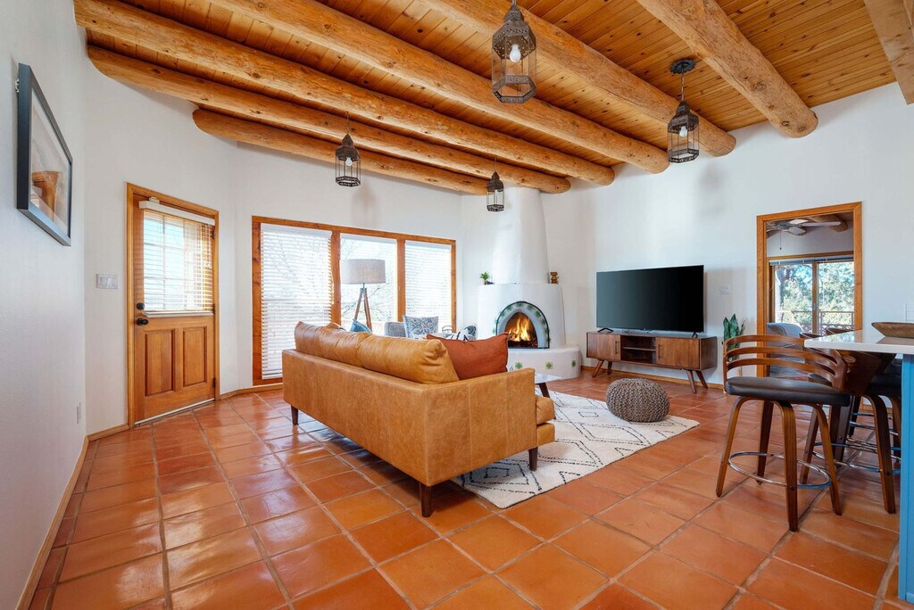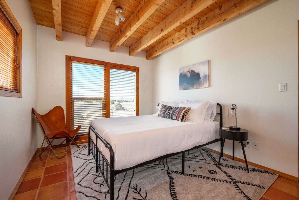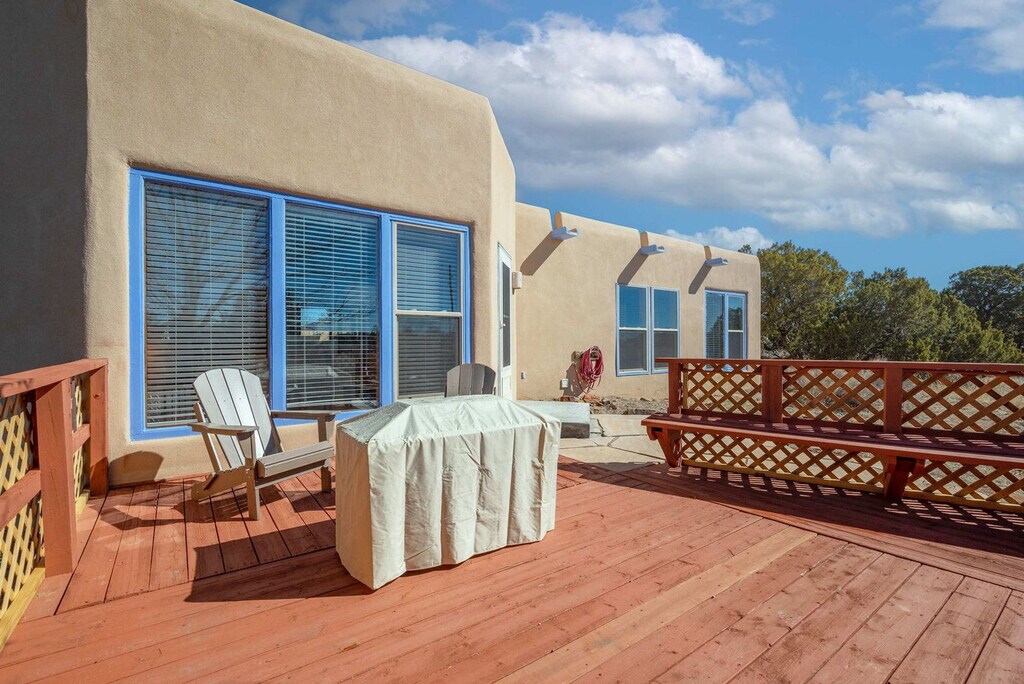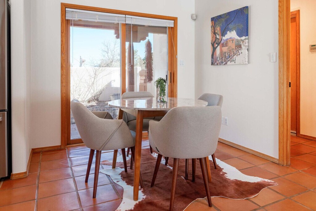 This stunning single-level home in El Dorado, NM offers three bedrooms, two bathrooms, and modern comfort with timeless elegance. Featuring an open living area, sleek appliances, and a large private backyard perfect for outdoor entertaining. Step inside and be greeted by an open and airy living area, featuring high ceilings, large windows, and plenty of natural light. The modern kitchen boasts sleek appliances, ample storage space, and a cozy breakfast nook perfect for your morning cup of coffee. Each of the three bedrooms is a tranquil oasis, complete with plush bedding, soothing decor, and plenty of space to unwind. The master suite features a king-size bed, spacious walk-in closet and a luxurious en-suite bathroom with a relaxing soaking tub. The second bedroom has a queen bed, while the third bedroom has a twin-size day bed and writing desk. Outside, you'll find a large and private backyard deck, perfect for outdoor entertaining or simply soaking up the sun. Enjoy a barbecue with friends and family, or relax with a good book in the shade of the covered patio off of the master bedroom. Baby equipment is available on a first-come, first-served basis for an additional fee. We can provide more details if you are interested. Located in the charming community of El Dorado, this home offers easy access to local shops, restaurants, and attractions. El Dorado features dining options like Upper Crust Pizza El Dorado, Thai on Canyon at El Dorado, and The Brunch Box Blue. For drinks, visit the Santa Fe Brewing Company Eldorado Taphouse. Nearby Santa Fe offers Canyon Road with its galleries and restaurants, the Santa Fe Plaza with museums and dining, and the Railyard District with arts and entertainment. The Santa Fe Ski Basin is about 45 minutes away, and Meow Wolf offers an immersive art experience. The home is equipped with a smart TV that allows you to stream your favorite shows but does not have traditional cable. The garage is not to be used for parking vehicles. Quiet hours are between 22:00 and 7:00. Smoking indoors is not allowed, and a $500 cleaning fee will be charged if you smoke in the house. Pets are not allowed, and a $300 cleaning fee will be charged if evidence of a pet is found. Off-street parking is limited to two vehicles in designated areas. Daily maid service is not included, and guests are responsible for purchasing additional items they may need. Fireplaces are available for use from September 15 to May 15, with materials provided for one or two fires. Check-in and check-out times are specified in the house manual, and a late check-out fee of $40/hr may apply if it interferes with the next guest's check-in time. The third bedroom includes a writing desk, providing a convenient space for remote work or study. A laptop computer is not included. Registration Number: 24-6039