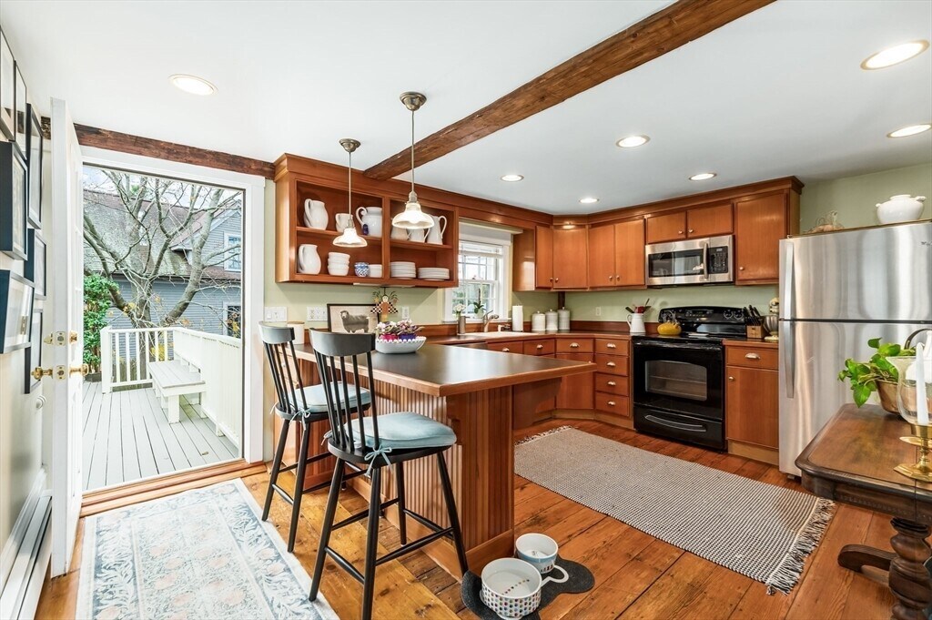 Charming seaside apartment in the heart of Manchester by the Sea. Located just moments from the beach,harbor,shops,restaurants,and the commuter rail,this well-maintained two-bedroom apartment offers coastal living at its best. Enjoy an open concept layout with abundant natural light and generous outdoor space,including a private 9 x 20 deck directly off the kitchen and a sizable yard ideal for gardening. The updated kitchen features custom cabinetry and an eat-in island Peninsula,a large pantry closet,an electric stove,dishwasher,and disposal. The spacious 15 x 15 living room showcases beautiful,wide pine flooring. Off the living room is a flexible room with a closet perfect as a second bedroom,office,or den. The expensive primary bedroom,20 x 17,is located on its own level and includes a washer and dryer,excellent closet space,and additional room for office space. MLS# 73457569