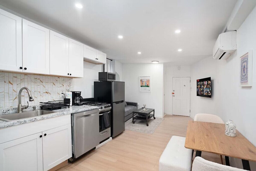 Feel at home in this stylish 1-bedroom, 1-bathroom East Village apartment, available September 1st. This apartment features a chic mustard sofa, modern decor, a flat-screen TV, and stainless steel appliances. Enjoy the lush green views. Located in the heart of the East Village, this apartment is steps from the city’s best bars, restaurants, nightlife, and trendy cafes. The sleek bathroom offers modern fixtures and storage, making this the perfect choice for those seeking a vibrant and centrally located NYC lifestyle. [SI]