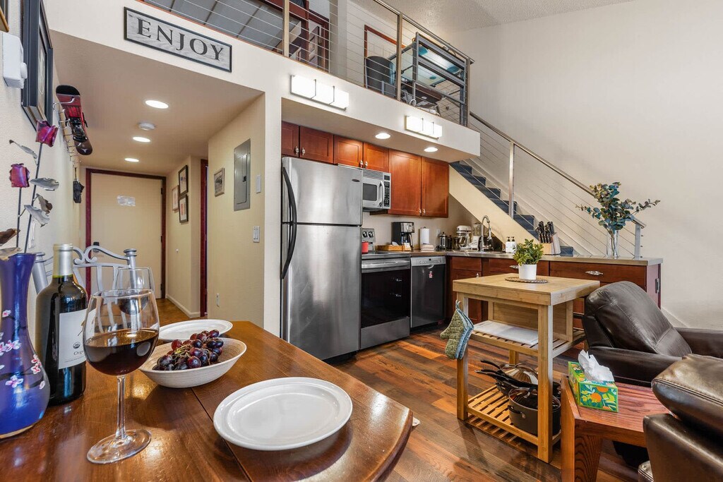 Escape to this charming 2-bedroom plus loft condo in the heart of Breckenridge! Located in the Der Steiermark building, this cozy retreat is perfect for families to feel right at home. The warm and inviting living area features vaulted ceilings and a classic wood-burning fireplace, perfect for cozy evenings. The kitchen is fully equipped with everything needed to prepare home-cooked meals. Complimentary Wi-Fi and cable TV are provided for comfort and entertainment. Step outside to the private balcony to enjoy picturesque views of the ski slopes and downtown Breckenridge. On-site garage parking is available. The condo is within walking distance of most attractions, and the Breckenridge Free Ride shuttle stop is nearby, providing easy access to the entire area. Located just steps from the Quicksilver SuperChair and a short walk to Main Street, this prime location offers easy access to Breckenridge’s best attractions. Explore the lively dining and shopping scene, hit the slopes, or take in the natural beauty of the Rockies, all just moments away. Quiet hours are between 9 PM and 7 AM. Registration Number: 452450002 [SI]