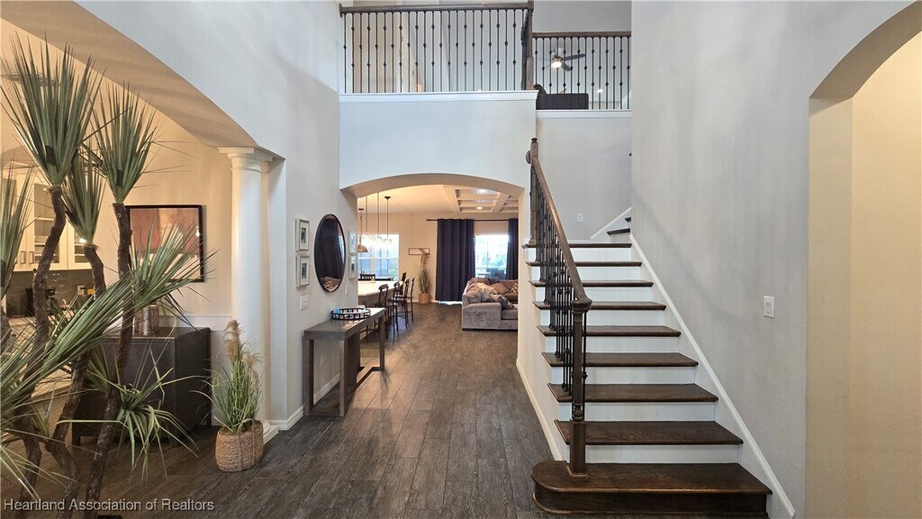 Stunning Waterfront Pool Home featuring 5 bedrooms, 4.5 bathrooms, and a 2 car garage all within this immaculate 4,532 square feet under air full of luxuries and offered FULLY FURNISHED. With over 150 feet of wrap-around water views and a 30 foot long pool, you will find all the oasis and serenity you'll ever need to get away from the bustling city life. Welcoming you at the foyer, the grandeur of this home presents itself with stunning height of the over 22 foot ceiling and grand views all the way through the glass sliders to view the pool. To the right is the office space ample in size and featuring over 10 foot ceilings as standard height throughout the whole home. You'll find the guest half bath and laundry facilities on the way through to the garage. The formal Dining Room is elegantly decorated and set just off the kitchen through the coffee nook. Witch a Kitchen measuring 22' long and all the counter space and appliances you'll need, you'll be cooking like a top chef in no time with plenty of space to entertain. Just across the Kitchen is the Living room designed with beautiful tray ceilings and beautiful ambiance. The Primary Bedroom is through the double doors and designed on a split-plan featuring dual walk-in closets one of which is 16x5 with the bedroom itself measuring 21x18 with its own plush couch and views overlooking the pool. Through the hallway in the oversized bathroom with walk-in shower big enough for everyone to enjoy. Upstairs are the four guest bedrooms and second family room equipped for games and lounging with a Pool Table and additional views overlooking the Pool and Waterview's. Out back you'll enjoy the serenity of the pool over looking pond with water fall from the jacuzzi to pool, sun-shelf and fully screened in for comfort during all times. Equipped with outdoor kitchen and plenty of space to entertain, this backyard features everything you'll need including wrap-around views of the water from every angle to find your peace in this home. Located in Arbor Lakes at Palmer Ranch is a welcoming community offering exceptional amenities, including a dog park, a resort-style pool with splash zone, a basketball court, and a sand volleyball court.