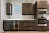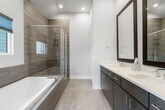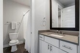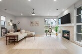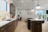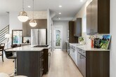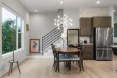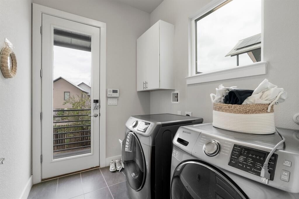 Discover modern living in this light-filled East Austin home tucked in the vibrant Agave community. Designed for comfort, style, and effortless entertaining. Step inside to soaring ceilings, wide blonde plank flooring, and an abundance of natural light that pours in throughout. The spacious kitchen features sleek quartz countertops, Bosch appliances, wine fridge, and ample storage, creating the perfect blend of function and modern design. The open living and dining areas are wired for surround sound and flow seamlessly, ideal for hosting friends or enjoying quiet evenings at home. A rare mother-in-law suite on the main level adds flexibility for guests, extended family, or a dedicated home office. Upstairs, a generous flex space offers room for a second living area, workspace, or creative studio. The primary suite is a true retreat with a bathroom ensuite and cozy gas fireplace that adds warmth and sophistication. Additional features include a detached garage accessed through a private back alley, full irrigation, and fully fenced. Refrigerator, washer, dryer, and select furnishings convey, including the living room couch, TV, and dining table with chairs. Located just minutes from Mueller, downtown Austin, and the airport, this home combines striking contemporary architecture with everyday convenience. Experience refined East Austin living with all the comforts of a beautifully designed home ready to enjoy.