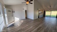 Move-in ready 4-bedroom,2.5-bath home situated on a desirable corner lot. The inviting living room features vaulted ceilings,a neutral color palette,wood-look flooring,and a cozy fireplace,perfect for cooler evenings. The kitchen is well-appointed with durable solid-surface countertops,shaker-style cabinetry,a stylish tile backsplash,pendant lighting,and a peninsula with breakfast bar seating. The split primary suite offers plush carpeting,a walk-in closet,and a private en-suite bath for added comfort and privacy. Enjoy outdoor living in the backyard with a full-length covered patio ideal for relaxing or entertaining,plus the added convenience of an RV gate.