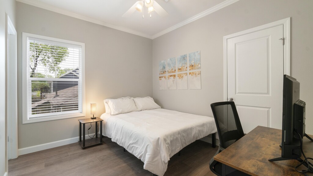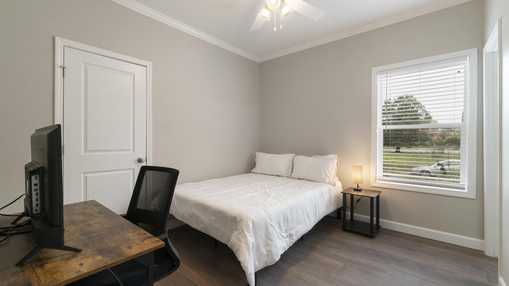 Room for rent: This beautiful home was built new in 2024 and features 6 spacious rooms. EACH ROOM HAS A PRIVATE BATHROOM! Come home to your own private sanctuary and take a load off. It's your space! This home is for professional people working hard to achieve their goals. We live by the Golden Rule: Treat others as you want to be treated! Each room features a queen bed, mini fridge, Roku TV, desk + chair workstation, reach-in closet, and ceiling fan. The walls in the home are double insulated for extra soundproofing and privacy. Common area includes a full kitchen, washer + dryer, dining room, and large front porch. Kitchen + cleaning supplies are provided and common areas are cleaned monthly! Parking is free on the street and there are 3 off-street spaces behind the house. Security cameras in front and back for peace of mind. The location is Westside Beltline! Just minutes from Mercedes-Benz Stadium, Midtown and Downtown. There is a MARTA bus stop ("50" line") in front of the house.