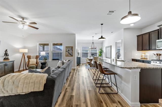 This stunning single-story home shines with modern style and thoughtful design. With an open-concept layout filled with natural light, it offers the perfect blend of comfort and functionality. The kitchen is a true centerpiece, featuring granite countertops, a large island, and stainless steel appliances — ideal for both everyday living and entertaining. The spacious primary suite offers a peaceful retreat with a well-designed layout and a relaxing ensuite bath. A split-bedroom floor plan provides added privacy, making it perfect for guests or a home office setup. Step outside to a covered back porch, perfect for grilling or enjoying your morning coffee, while the large grassy backyard offers plenty of space for pets, play, or a future garden. Located in a vibrant community with amenities including a pool, park, and playground — everything you need for comfortable living is right at your doorstep. Ask about the $0 down financing that is available on this amazing home.