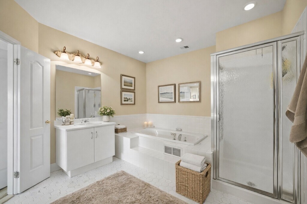 Beautifully maintained, sun-filled end-unit townhome available for rent in the sought-after Timberbrooke Community. With over 2,500 sq ft of spacious living, this home offers an inviting open layout ideal for everyday comfort and entertaining. The main level features an impressive two-story foyer with a graceful curved staircase. The generous living room showcases a warm wood-burning fireplace, elegant plantation shutters, and custom ceiling detail, and flows directly into the formal dining room, accented by a vaulted ceiling and stunning sunburst window. The expansive eat-in kitchen provides endless cabinetry, ample counter space, a pantry, and a separate dining area with glass doors opening to a private deck. A first-floor bedroom and full bath add flexibility and convenience. Upstairs, the primary suite includes a custom walk-in closet and a luxurious bath with dual vanities and a relaxing jetted tub. Another bedroom with its own ensuite bath, plus an upstairs laundry area complete the second floor. Additional highlights include a one-car garage, parking for three more cars in the driveway, and access to fantastic community amenities, including a pool, tennis courts, and a playground. Don't miss this exceptional rental!