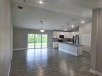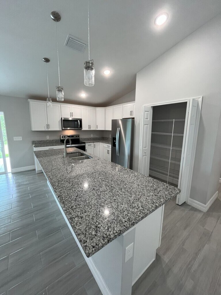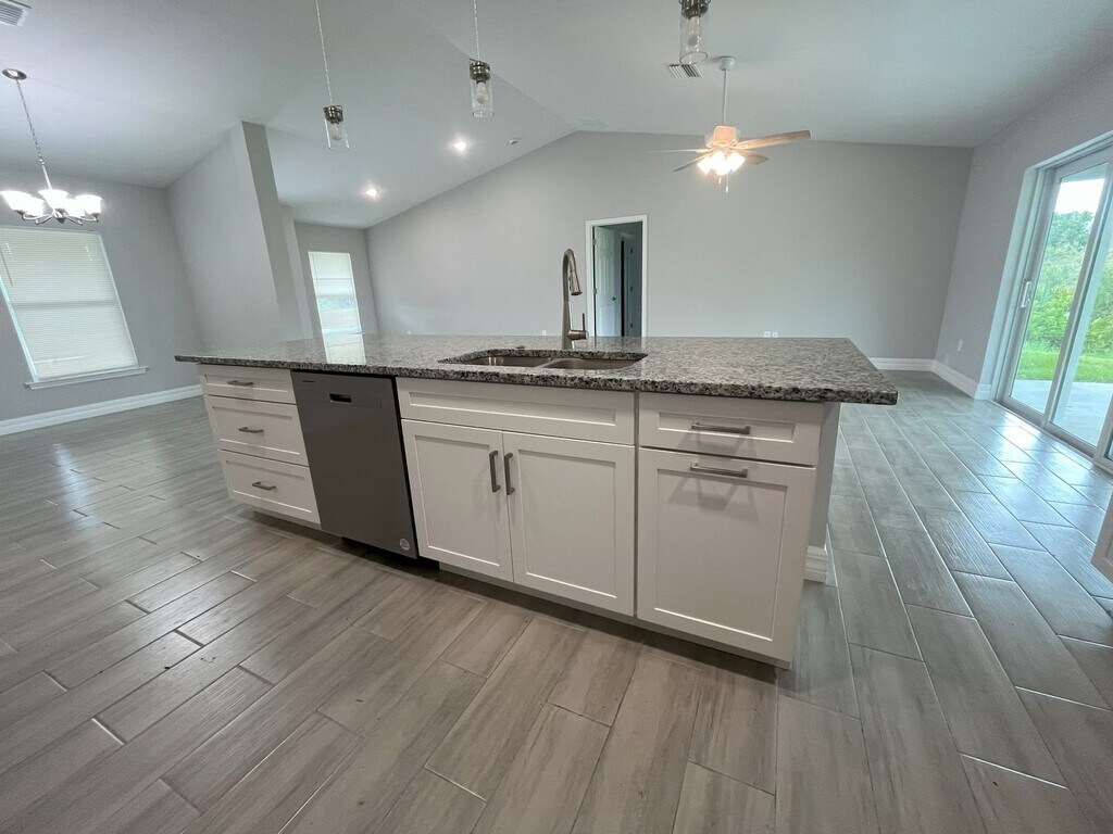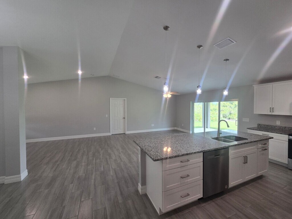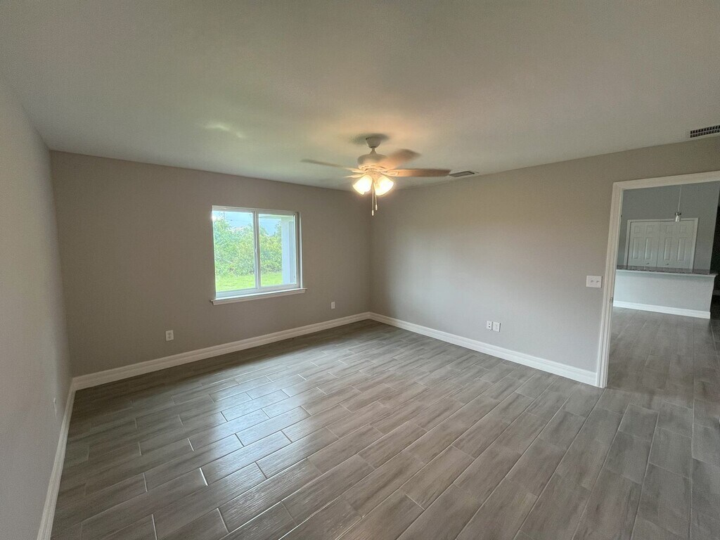 Welcome to a modern custom-built home nestled in the heart of Lehigh Acres, FL. Very close to Buckingham, in a tranquil private setting. This newer construction home boasts a spacious three-bedroom, two-bathroom layout with a split floorplan for added privacy. The primary bedroom has his and hers closets, also features an en-suite with dual vanities and a huge walk-in shower with two shower heads. The kitchen is a chef's dream with stainless steel appliances, granite counters, wood shaker cabinets, and a large island. The home is filled with natural light, highlighting the beautiful tile flooring throughout. The vaulted ceilings in the living room add to the spacious feel of the home. The property sits on a large quarter-acre lot with a sizable backyard, perfect for pets. Enjoy the Florida weather on the large front porch or through the triple sliding door leading to an open lanai. The home also features a two-car garage with an access door and opener, inside laundry with washer and dryer hook-up. Impact windows to ensure your family is safe in any storm. Conveniently located close to all amenities in Lehigh Acres and Buckingham, this home is move-in ready. Don't miss out, see it today!