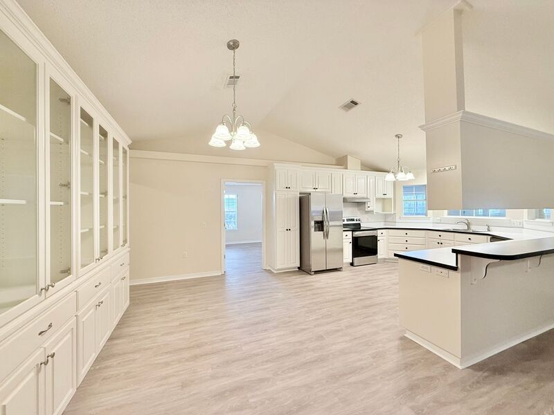 View In 3D: This spacious 3-bedroom, 2-bath home is conveniently located off Berryhill Rd, just minutes from NAS Whiting Field. The large, open living area boasts a beautiful stone fireplace and built-in entertainment center with shelving. The kitchen offers abundant cabinet and counter space and a hop-up breakfast bar for easy meal prep & casual dining. Appliances include a French door refrigerator, flat top range/oven, and dishwasher. A dual basin sink looks out through a large window and a cozy eat-in area provides a beautiful built-in china cabinet. The primary suite has a tray ceiling with fan, plush carpet, and an ensuite bathroom featuring a garden tub, standing shower, single sink and large vanity with generous counter space. Two additional bedrooms include comfortable carpet, spacious closets, and share a second full bath with single vanity and tub/shower combo. Additional features include a large bonus room, providing the perfect flex space, a dedicated laundry room with space for a full-size washer and dryer, and a fully fenced backyard with raised concrete patio and storage shed.