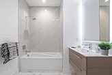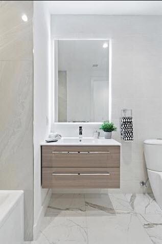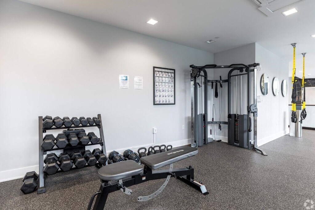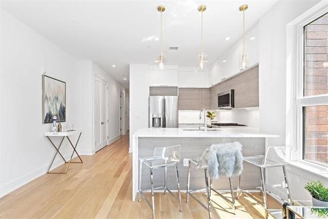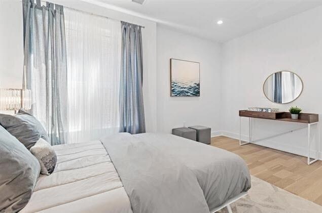 Step into this stunning 2-bedroom, 1-bath apartment, designed with style and functionality in mind. The open kitchen features two-tone cabinetry, marbled quartz countertops with a waterfall edge, and GE Profile appliances with a fully vented range hood. Natural oak floors flow throughout, while the bathroom impresses with a floating vanity, LED-lit mirror, and large-format porcelain tiles. The primary bedroom includes a spacious walk-in closet for ample storage. Enjoy a full-size Whirlpool washer and gas dryer in every unit. Amenities include a private garage with assigned parking (additional parking $200), a chic lobby/lounge, fitness center, and cozy library. Perfectly located near NYC transportation, shopping, restaurants, and essentials. Pets up to 30 lbs welcome. Move-in ready—your modern home awaits!