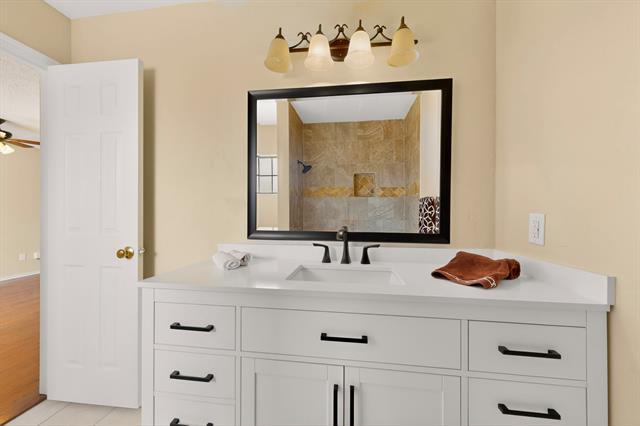 A 2-story house with 3 bedroom 2.1 baths, open floor plan, formal dining, living room with gas FP, kitchen with a breakfast bar, new electric glass cooktop, new dishwasher, new farm sink and faucet. The 3 baths are updated with new vanities with granite countertops. The stairs and second floor have nail down hand scraped hardwood flooring and a linin closet. Primary bedroom is huge with lots of windows and a balcony, ensuite bathroom & linin closet. Primary bathroom has a walking closet, jetted tub, standalone shower, new 65-inch new vanity with dule sinks, faucets and mirror. The second bedroom upstairs has two closets and ensuite huge private full bath, which is updated with new 60-inch vanity, mirror and shower tub with high end faucets. A private courtyard and an oversized garage are a plus for this property. Downstairs bedroom could be used as an office; it has standalone armoire. Washer, dryer and fridge will stay.