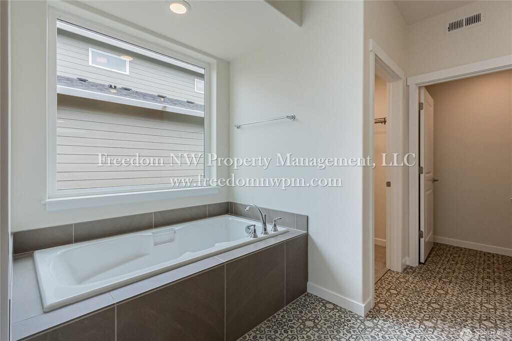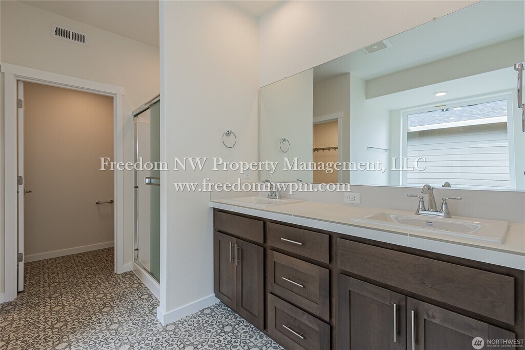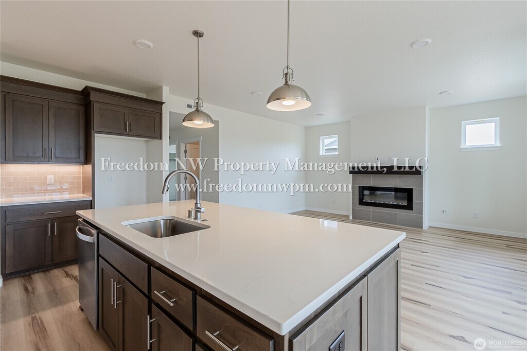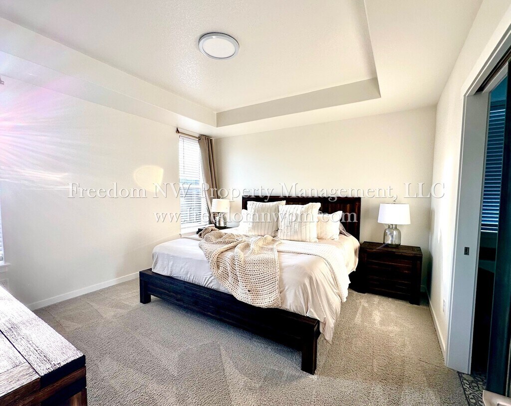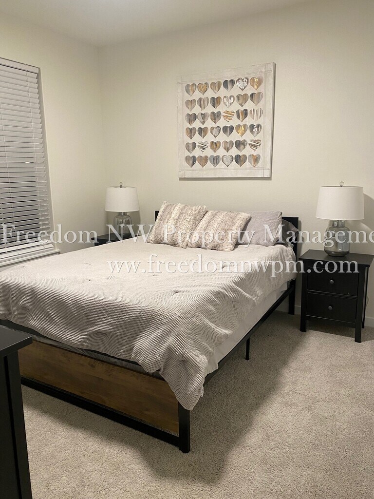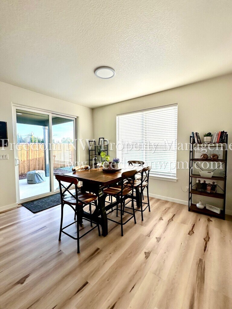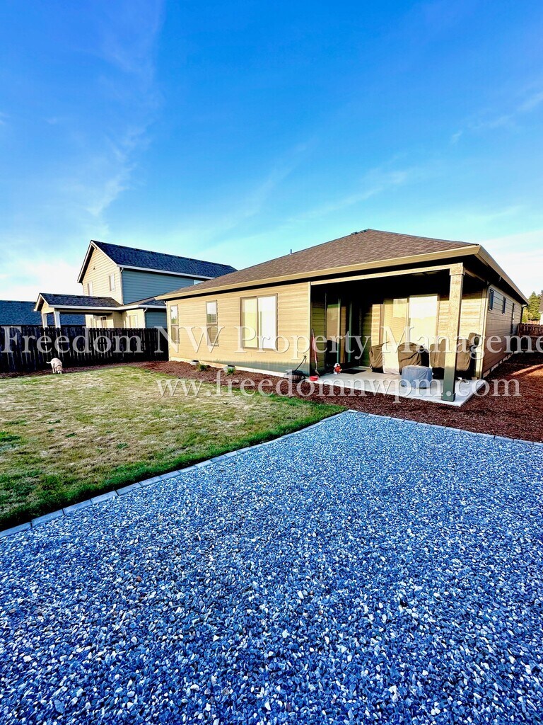 Beautiful and spacious single-level modern farmhouse with 1,781 sq. ft. of living space! This 4-bedroom, 2-bathroom home features custom alder cabinets, luxury vinyl plank waterproof flooring, a cozy fireplace, and a covered back patio—perfect for relaxing and enjoying the sunset views. The kitchen includes a refrigerator, dishwasher, microwaver and range, and the laundry room comes with a washer and dryer (as-is). The primary suite offers a soaking tub, dual sinks, separate shower, and a walk-in closet. You'll stay comfortable year-round with a heat pump and air conditioning. The yard is fully fenced and landscaped with a sprinkler system. A 2-car garage provides plenty of parking and storage. Located in the desirable Grand Prairie Estates neighborhood with a community park and playground. Easy access to I-5 for commuting. Pets Welcome! No smoking. Move-in date is negotiable.