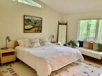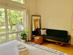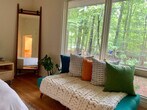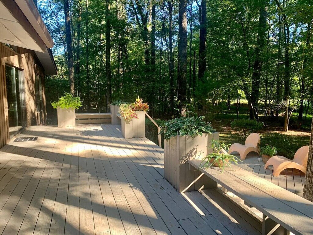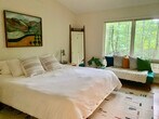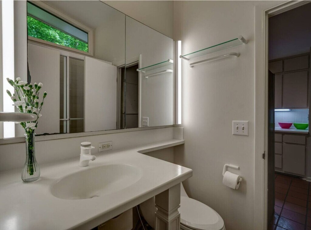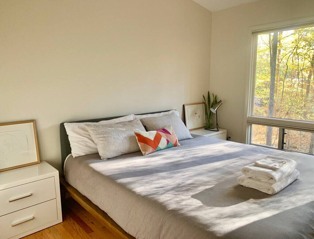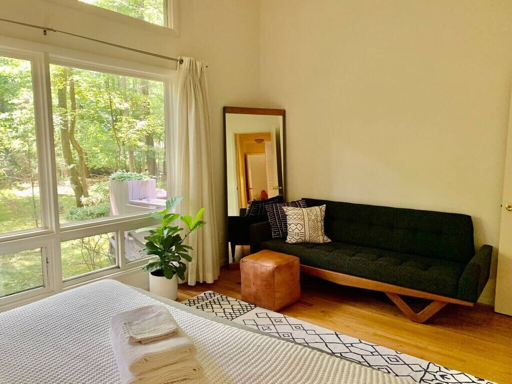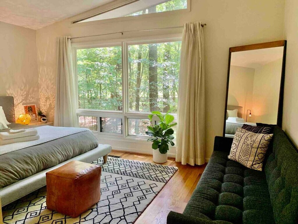 This curated 3-bedroom, 2-bathroom mid-century modern Chapel Hill home blends comfort, style, and nature in perfect harmony. Designed by renowned local architect JP Goforth, the home sits on a wooded acre with a private creek and features king beds in every room, Sonos audio, and fiber WiFi. Relax on the deck, fire up the grill, or unwind inside surrounded by stunning hand-selected art and furnishings. Minutes from UNC, Whole Foods, and Eastwood Lake, it’s a true retreat for anyone craving serenity and style. Designed by local legend and architect JP Goforth and wrapped in nature, this one-level mid-century gem blends iconic design with thoughtful hospitality. This tranquil retreat is steps from Eastwood Lake, a 10-minute drive to UNC, and perfect for peaceful escapes or connecting with loved ones. The home offers three spacious bedrooms with king beds and premium linens, two bathrooms with rainfall showers and bidets, and a kitchen with a gas range and coffee-making essentials. The living room features Moroccan rugs, live plants, and a 65-inch Apple TV. Enjoy fiber internet, Sonos sound system, and multiple indoor reading and relaxing nooks. Each room features original, signed artwork, and the back deck offers a gas grill and forest views. The home has several fireplaces that may be used with prior permission only. This safe neighborhood has easy access to Whole Foods, Trader Joe's, UNC Chapel Hill, and Duke University. Nearby attractions include Research Triangle Park, University Mall, Gimghoul Castle, Morehead Planetarium, Memorial Hall, Haw River Ballroom, Cat’s Cradle, Ackland Art Museum, Paul Green Theatre, North Carolina Botanical Garden, Cedar Falls Park Kids, Hollow Rock Nature Park, and Duke Forest. Dining options like Kipos Greek Restaurant, Cafe Driade, and Squids Restaurant are also close by. Essential services such as Whole Foods Market, Trader Joe’s, Wegman’s, Walgreens, CVS, UNC Hospital, and Duke University Hospital are conveniently located. RDU Airport is 18.1 miles away. The home is generally not suitable for young kids due to expensive items. If you'd like to bring young children, please get in touch to ensure a good fit. As an older home from the 70s on a wooded acre, outdoor bugs may sometimes find their way indoors, especially if the deck sliders are left open. The house is regularly treated for pests and professionally cleaned weekly. Absolutely no parties are allowed, and all guests must be registered. Quiet hours are after 10pm and before 8am as part of our good neighbors policy. Pets without permission will be charged $200. Excessive messes and unauthorized late checkouts will be billed at $50 per hour. With fiber internet (404+ Mbps), a 65-inch Sony TV with Apple TV, and a Sonos stereo system throughout, it's an entertainer's dream. Perfect for working from home or simply relaxing by yourself or with family and friends. Multiple indoor reading and relaxing nooks provide ample space for work or leisure. [SI]