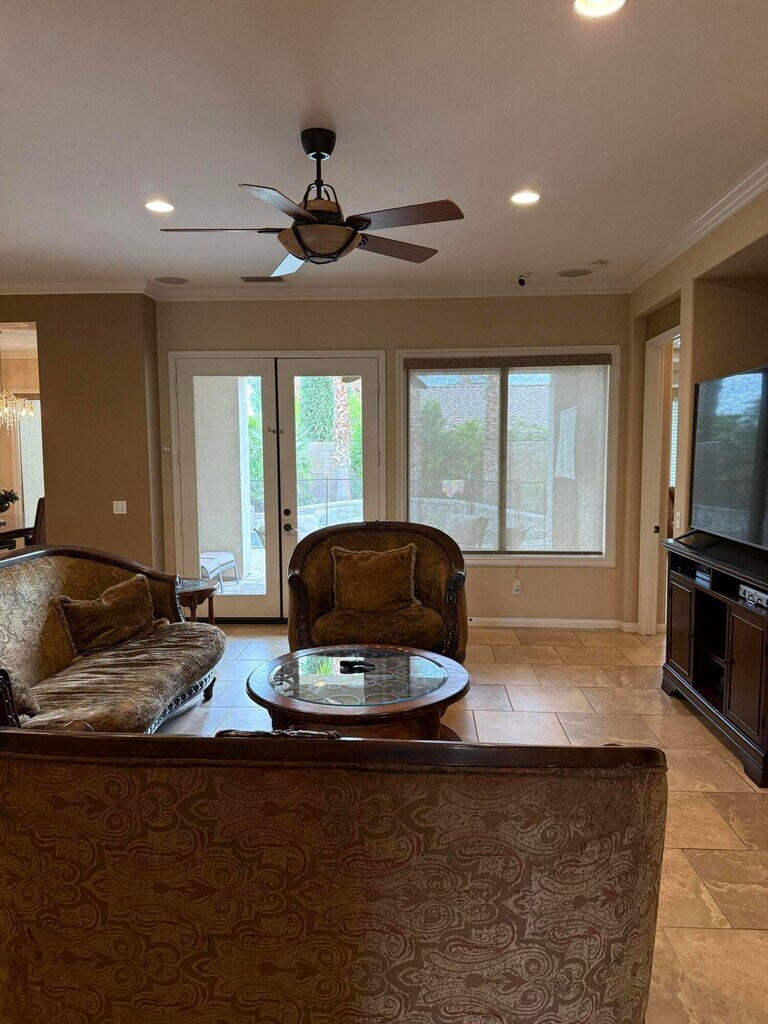 Residential property located on a cul-de-sac lot with over 2,700 sq ft of living space,offering 4 bedrooms and 4 bathrooms,including a detached casita with its own full bedroom and bathroom. Upgrades include 20' tile flooring,10' ceilings,crown molding,and a spacious great room with custom fireplace and built-in media. The chef's kitchen features a large island,granite counters,stainless steel appliances,double ovens,and gas cooktop. Unique features include a private cigar roomand multiple guest spaces. The backyard is built for entertaining with a saltwater pebble-tec pool/spa,covered patio,BBQ bar,outdoor fireplace,and expansive side yard with mountain views,gazebo,and lush landscaping. MLS # 219146346