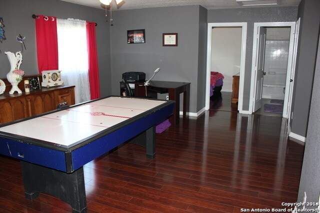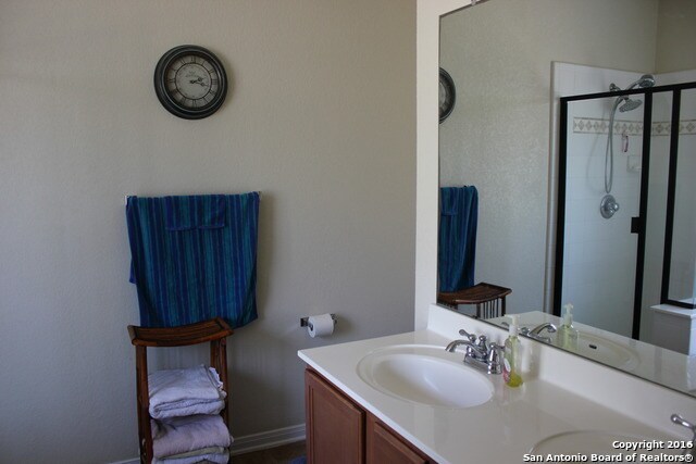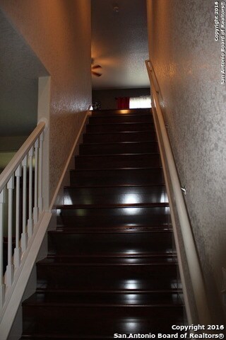 Gorgeous Wood Laminate Flooring to include the stairway. The kitchen has Stained Cabinets, Black Appliances, Built-In Microwave, Recess Lighting, & Breakfast Bar Great Master has a full bath with a Separate Glass Shower/Tub, & Double Vanity, and a Sophisticated Paint Palette. Upstairs has a big Game Room, Bedroom, & Nice Full Bath, and a sliding Glass Door that Opens to a spacious backyard. Lovingly maintained property that has easy access to IH-35, Randolph AFB, and plenty of shopping at The Forum. No pets allowed.
