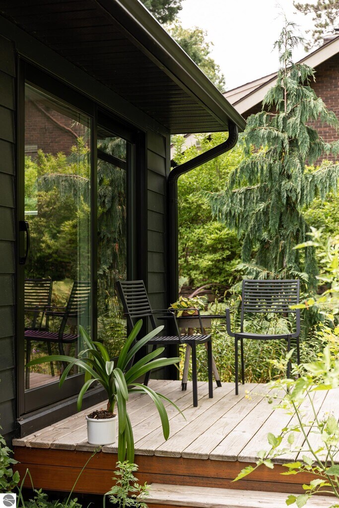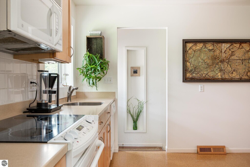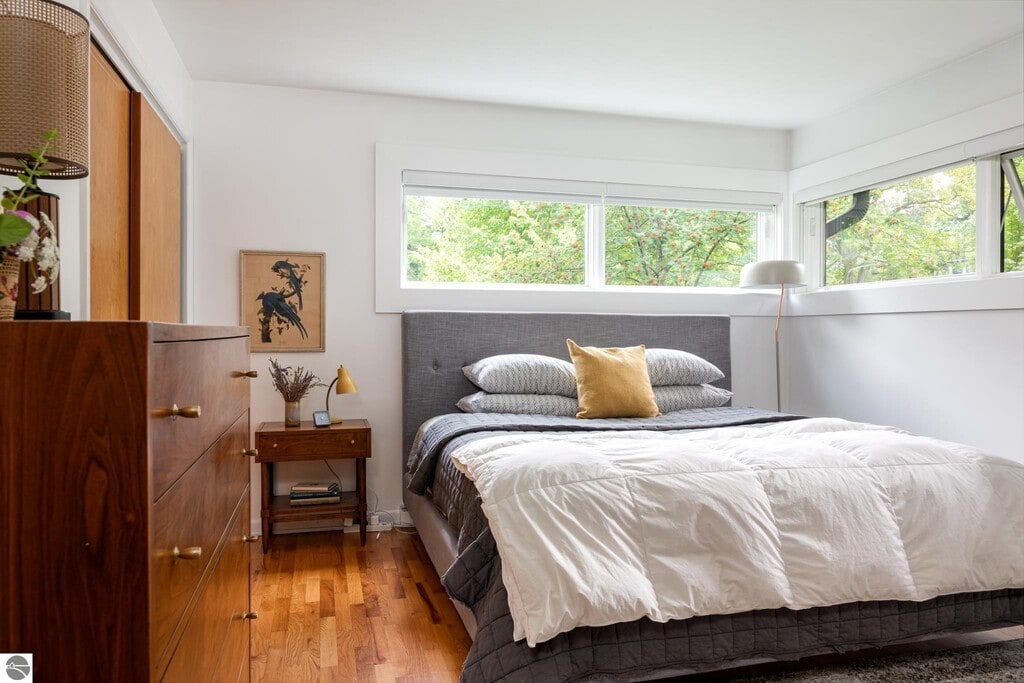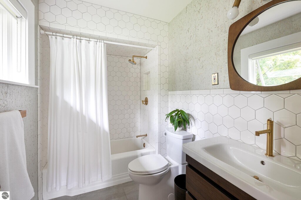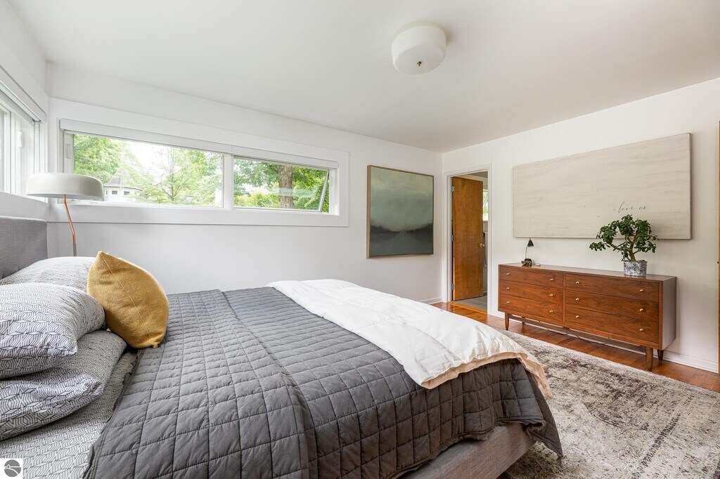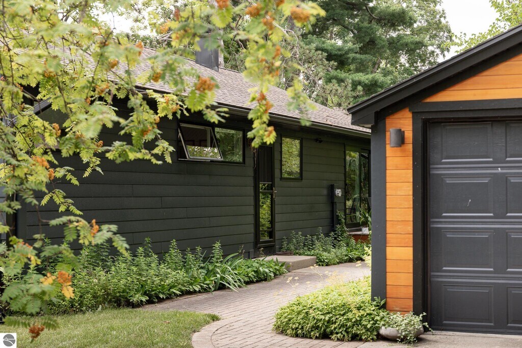 Iconic, mid-century ranch, gracefully situated on a manicured corner lot, adorned with flowering bushes and ornamental grasses. This 3 bed/2 bath home was built in 1956 and has been lovingly updated with meticulous care for historic integrity. Each room showcases the home’s contemporary style and inviting design elements. The natural texture of the hardwood floors spans nearly the entirety of the main level and expertly greet the modern aesthetic of the black hexagon tile floor in the hallway bath. The hallway bath also features a stunning, custom-design stand-up shower, floating vanity, and clean white tile that expertly compliments the dark floor. The spacious living room is bright and airy with a picture window that faces the historic brick street, capturing the innate charm of the surrounding neighborhood. Natural light streams in from every angle with numerous windows, including horizontal transoms in nearly every room. The master bedroom boasts handsome corner windows and an ensuite bath with a crisp white shower featuring brushed gold fixtures. There are 2 additional sizable bedrooms on the main level as well as an unfinished basement level below for laundry, ample storage, and more. Step out of the dining area onto a deck and into a tranquil backyard oasis. The patio area is surrounded by a privacy fence on 3 sides and flanked by mature trees, lovely flowers and detached 2-car garage. All this modern, main-floor living resides within the quiet Central Neighborhood of TC and is conveniently walkable to Munson Medical Center, GT Commons, TART Trail, West Bay beaches, and downtown Traverse City’s premier dining, shopping and entertainment!