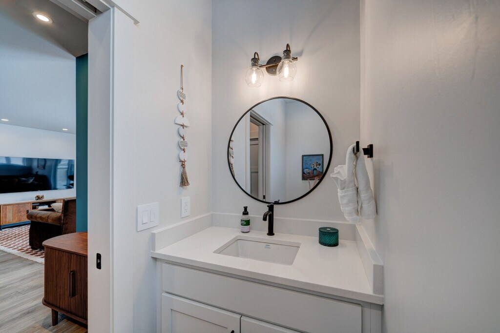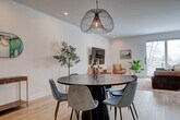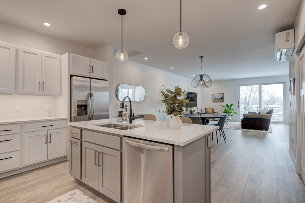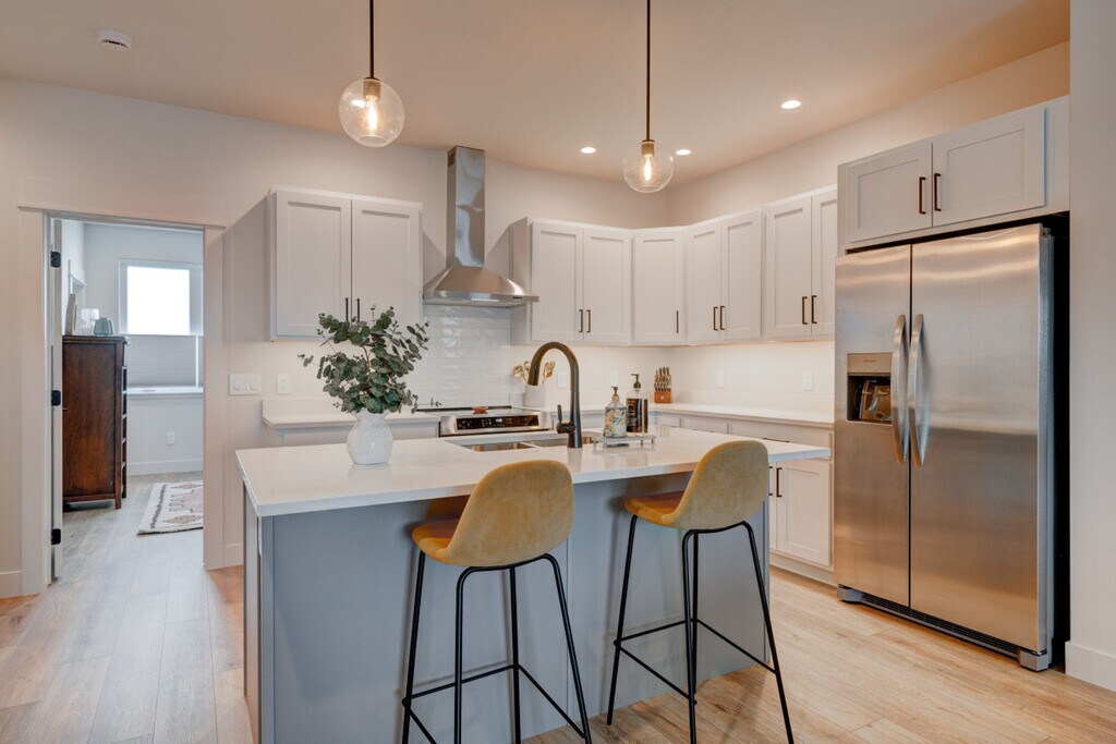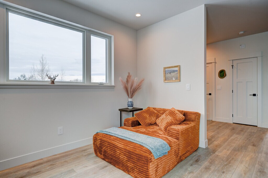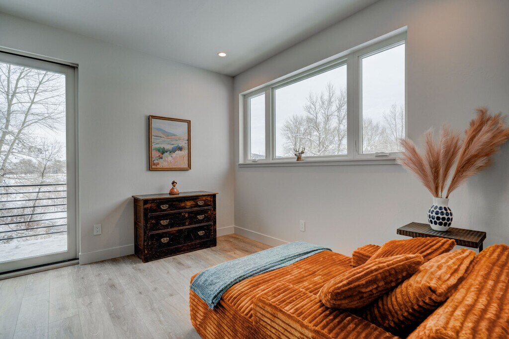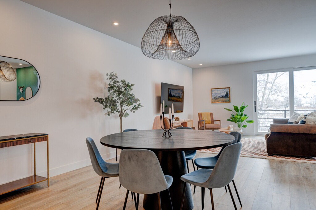 Brand new construction completed in December 2024, this upscale apartment offers a perfect blend of modern luxury and natural beauty. Watch wildlife from your private patio overlooking Bozeman Creek and the nature preserve beyond. The apartment is located on the upper level above office space, with a private entrance and stairs required. This newly constructed apartment features 1 bedroom, 1.5 bathrooms, and sophisticated finishes throughout. The modern cowgirl aesthetic blends impressionist paintings with western flair, creating a stylish mountain retreat. Abundant natural light and thoughtful design create an ideal space for extended stays or weekend getaways. The main living area includes a leather sofa, rocking chairs, a 75" Smart TV, a reading nook with an oversized armchair, and a dining area with seating for 6. The home office is equipped with an electric sit/stand desk and an external monitor. The fully equipped chef's kitchen features an island with seating and sink, an induction range, a full-size refrigerator/freezer with ice maker, a dishwasher, and is fully stocked with cookware and essentials. The bedroom offers a king-size Sleep Number bed and an ensuite bathroom with a glass walk-in shower, along with a charming powder room at the entry and a full-size washer and dryer. One dedicated off-street parking space is provided. Up to two well-behaved dogs are welcome with an additional non-refundable fee. Guests are expected to keep dogs on leash and pick up after their messes. The other side of the creek is a nature preserve, on which dogs are prohibited. Located in a developing light manufacturing area en route to Bridger Bowl, this apartment offers easy access to both urban amenities and outdoor recreation. It is within walking distance to the vibrant Cannery District and just 1.3 miles (5 minutes) from downtown Bozeman. Key distances include Downtown Bozeman at 1.3 miles (5 minutes), Bozeman Airport at 9.5 miles (16 minutes), Bridger Bowl at 15.8 miles (22 minutes), and Yellowstone National Park (North Entrance) at 81 miles (90 minutes). Bozeman offers world-class skiing, hiking, mountain biking, and outdoor recreation. The vibrant downtown features local shops, restaurants, galleries, and essential services. Check-in time is at your convenience, anytime after 4 pm, and check-out time is 11 am. Unplanned late checkouts will be charged $50 per hour, with a 10-minute grace period before the charge is incurred. While this may seem strict, the charges are passed on from the cleaning team when they have to wait for you to depart before they can begin cleaning. No loud parties or late-night noise is allowed. Treat the home, the furnishings, and the neighbors with respect. Includes a home office with an electric sit/stand desk and an external monitor. A laptop computer is not included. [SI]