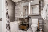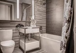 Experience the best of Manhattan from this spectacular building. With sweeping views and hand-picked furnishings, this luxurious property offers elegant apartments with designer kitchens and hardwood floors. Located near the Theater District, the Javits Center, and public transit, you'll feel at home in this walkable neighborhood. Combining the premium amenities of a high-end resort with the space and privacy of a home, this beautiful tower offers sophisticated city living. Wake up to the day through massive floor-to-ceiling windows, with each bed outfitted with premium linens and spacious closets. The bathrooms feature Olympic Gray porcelain tile and modern fixtures, including glass-walled showers with city views. The Italian-crafted kitchen, equipped with European appliances and quartz countertops, invites you to dine in style. There is an additional fee for all amenities, including access to the Life Time Athletic Club, two outdoor pools, and valet parking. Cribs are available upon request and may incur additional fees. Pets are welcome with a fee of $250 or $500, depending on the pet policy, which may include restrictions on pet size and breed. This address is one of the best in Manhattan, putting you within walking distance of Times Square, the Theater District, the Javits Center, and a plethora of shops and restaurants. For further journeys around the NYC metro, Port Authority Station and the Midtown/W. 39th St. ferry terminal are just a few blocks away. All guests are required to wear a mask in all non-private areas at all times. The use of amenities is subject to fees and availability. Photos are representative of the actual apartment, and there may be differences in furniture and layouts of the assigned unit. A laptop computer is not included. The airy floor plan, illuminated by natural light, provides ample space for families, friends, colleagues, or solo travelers to relax and recharge. Whether you prefer to watch the game, catch up on emails, or admire the city views, you'll find the perfect spot to do so.