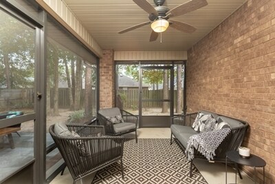 Beautiful 4 bedroom, 3 bathroom house in highly sought after Stonechase neighborhood. Gated community with attendant. Hardwood floors throughout main living area. Surround sound installed in living room. Kitchen furnished with granite counters, stainless appliances, and breakfast nook area. Spacious master includes very large walk-in closet, private bath with garden tub. Guest room has private ensuite bathroom. Bonus room with French doors can be used as an office space or play room. Screened in porch, outside patio, gas fire pit. Coveted lot with shaded back yard and conveniently located across from the neighborhood park. Highly desirable school district to include brand new Wallace Lake K-8 and Pace High. Make this your home!