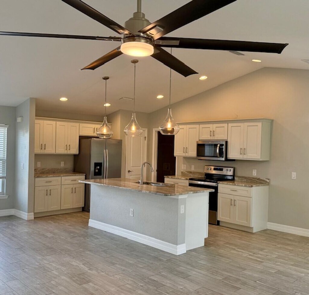 This 1,440 SQ FT stunner features soaring ceilings, an open-concept layout, and upscale finishes throughout. The kitchen shines with stainless steel appliances, stone countertops, and designer lighting. Enjoy a split floor plan with a spacious master suite for added privacy. Step outside to a fully fenced yard and screened lanai — perfect for relaxing or entertaining. Premium living, prime location!
