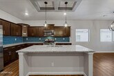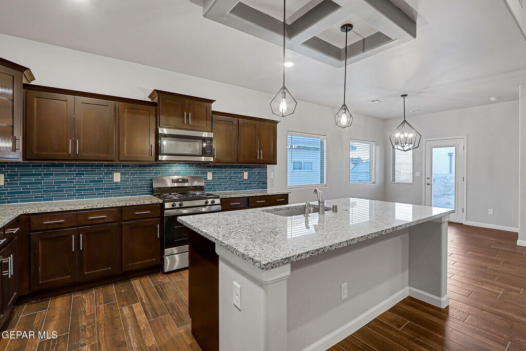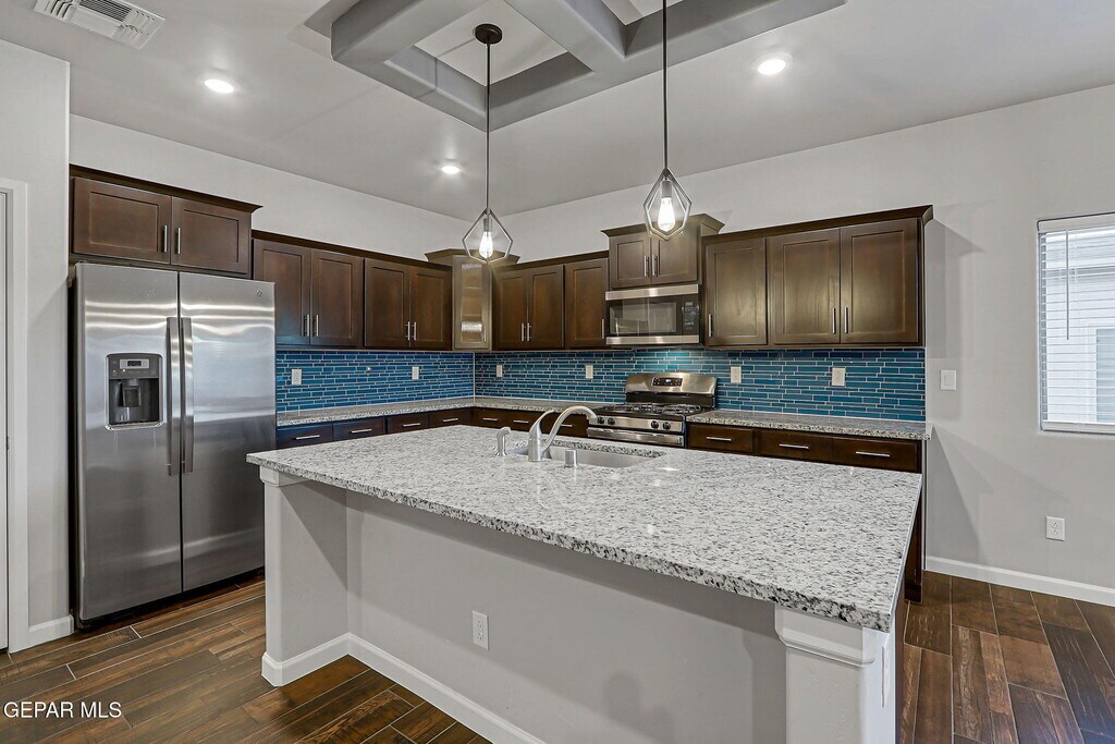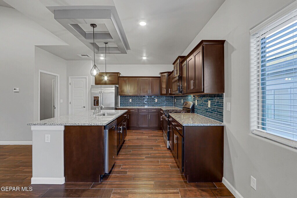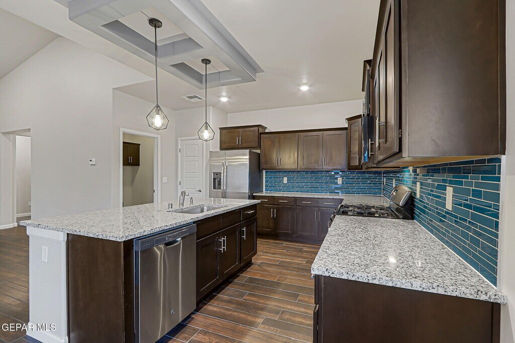 Discover the ideal blend of style,comfort,and convenience in the heart of Valencia Park. This stunning single-story home offers 4 bedrooms,2.5 baths,and a spacious open-concept layout designed for modern living. The chef's kitchen impresses with granite countertops,stainless steel appliances,and generous workspace. Elegant touches like hand-troweled walls and wood-look ceramic tile elevate every room. Retreat to the luxurious primary suite featuring a walk-in shower,relaxing soaking tub,and beautifully illuminated vanities. Built for efficiency and peace of mind,this Energy Star Certified home includes a tankless water heater,high-efficiency windows,and full spray foam insulation. With quick access to I-10 and Loop 375,commuting to West El Paso is effortless. Located in a quiet,family-friendly neighborhood,this exceptional home combines beauty,practicality,and energy savings. Schedule your private showing today!