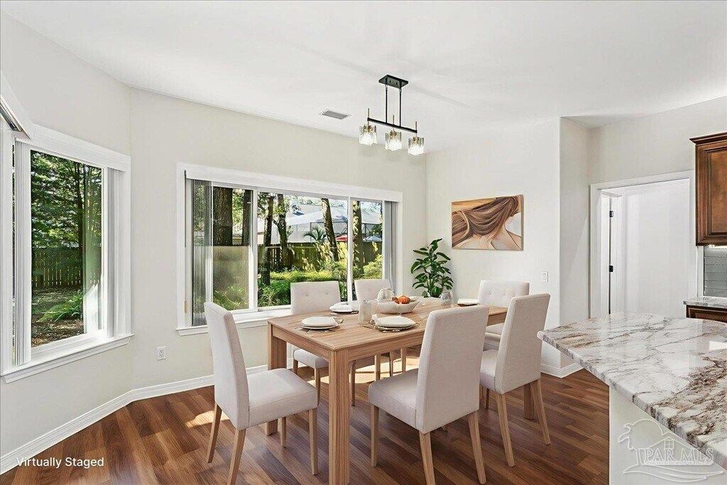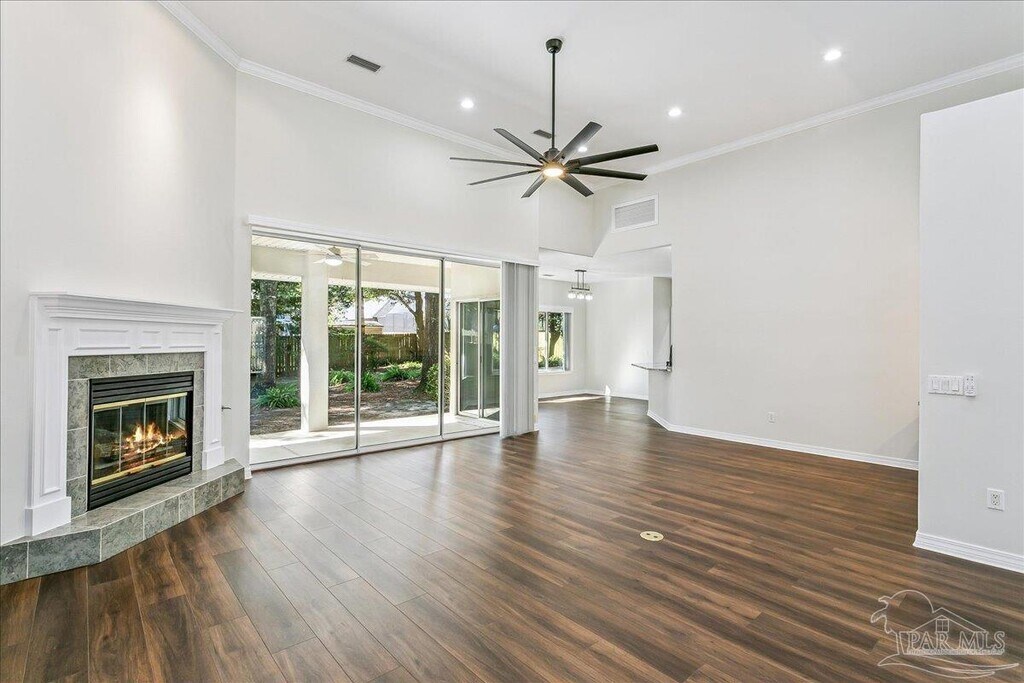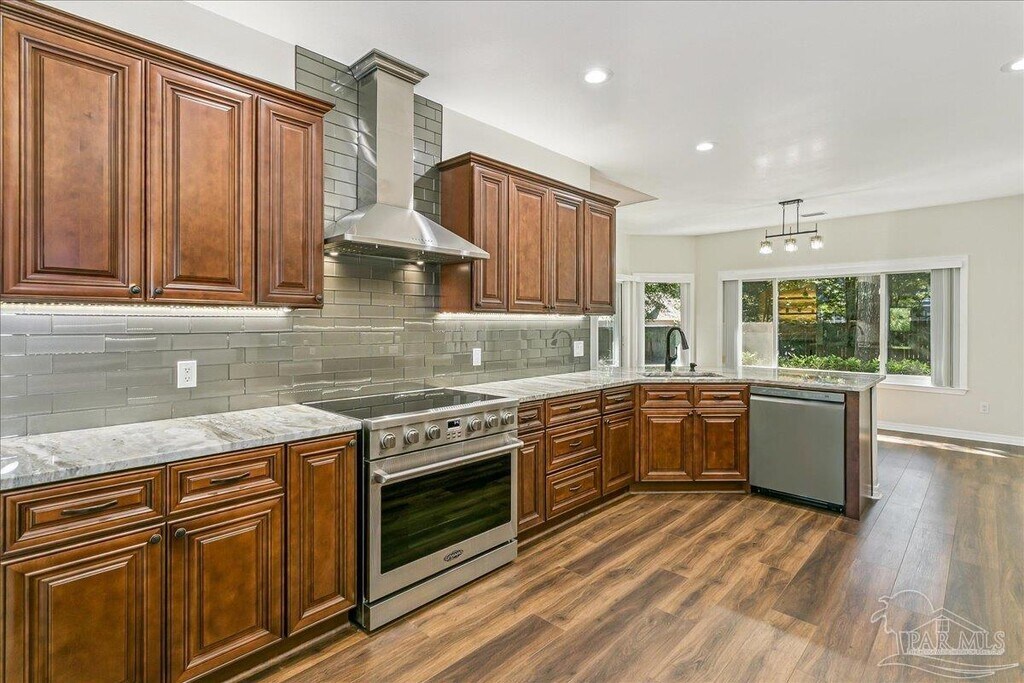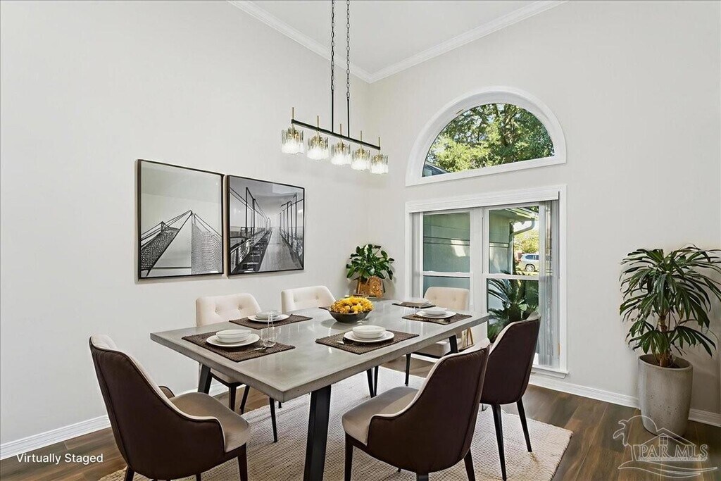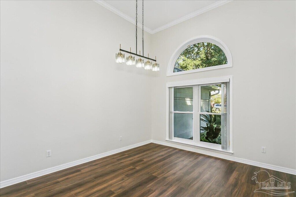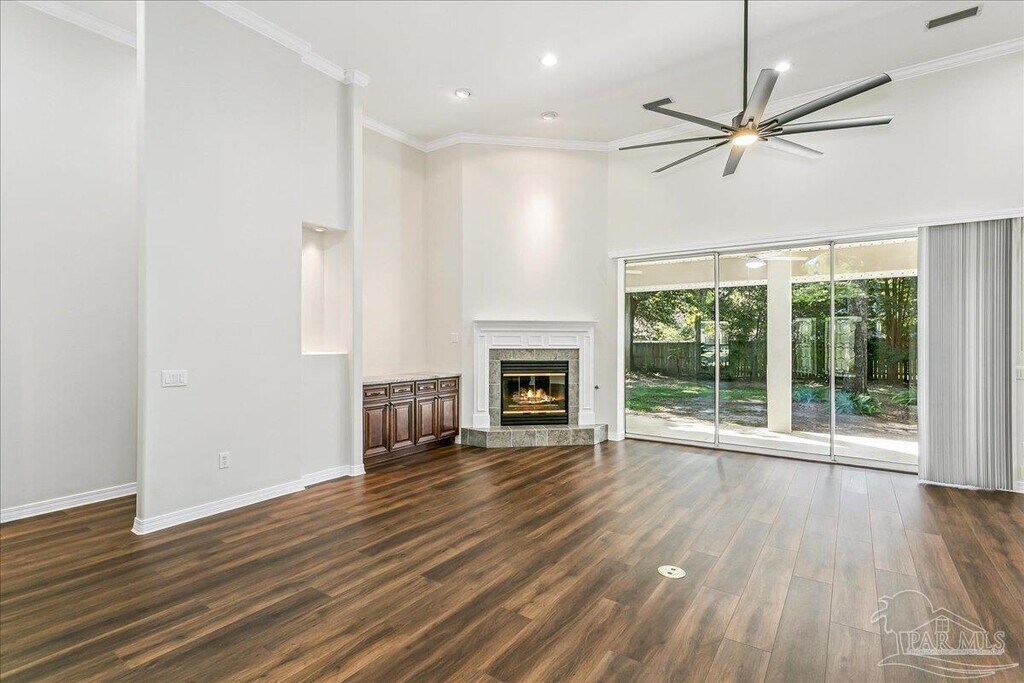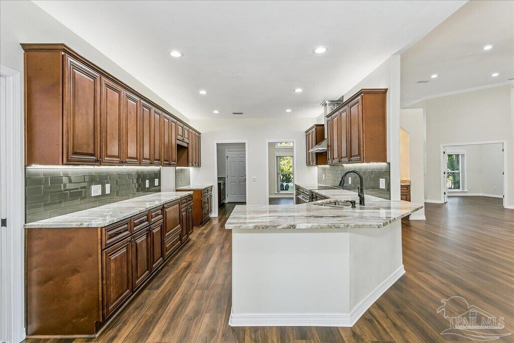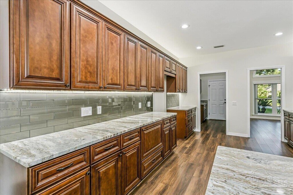 Prepare to be stunned by this immaculate rental home in Pensacola's well loved Marcus Pointe Golf Community. Enjoy the delightful architectural touches including crown molding and arched windows along with 12 ft ceilings. Spacious open concept design is perfect for entertaining with formal dining room,wet bar in the expansive living room with 3 part sliding doors opening to the covered patio. Large chef inspired kitchen complete with 36 inch stainless steel flat top stove,elegant stainless steel hood,durable marble countertops and abundant cabinet space for appliances and cookware. Even more storage and utility sink in the off kitchen laundry/pantry with w/d hookups. Luxuriate in the spa like finishes of the primary bath including fully tiled walls,free standing jetted tub with private garden window for abundant natural light. Oversized walk in shower complete with dual shower heads. Plenty of storage with dual vanity,large built in linen and his & hers walk in closets. The primary bedroom boasts a built in desk and direct access to the delightfully shaded,private backyard. Split floor plan means extra privacy for both Primary and the guest suite located off the kitchen with two large bedrooms joined by an ensuite bath. Walk in shower,dual vanity with lighted mirror and marble backsplash. The backyard offers a peaceful natural landscape with mature oaks,ferns and flowering azaleas. Large two car garage with extra parking pad on driveway. All just a short drive from dinning and shopping in downtown,NAS Pensacola and our famous sugar sand beaches. Contact owner for questions and showing,Five Two Zero 900.2800. Minimum 6 month lease. $40 application fee per applicant.