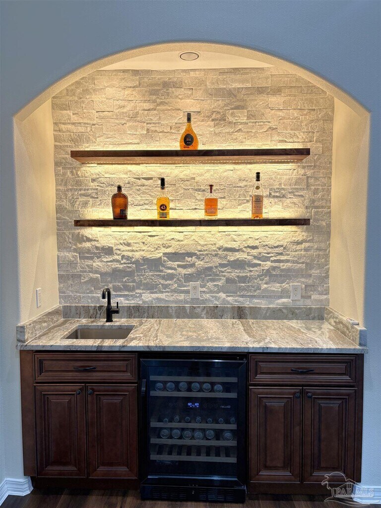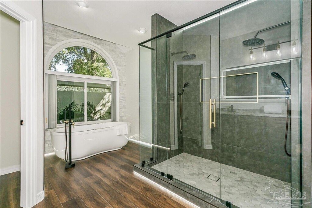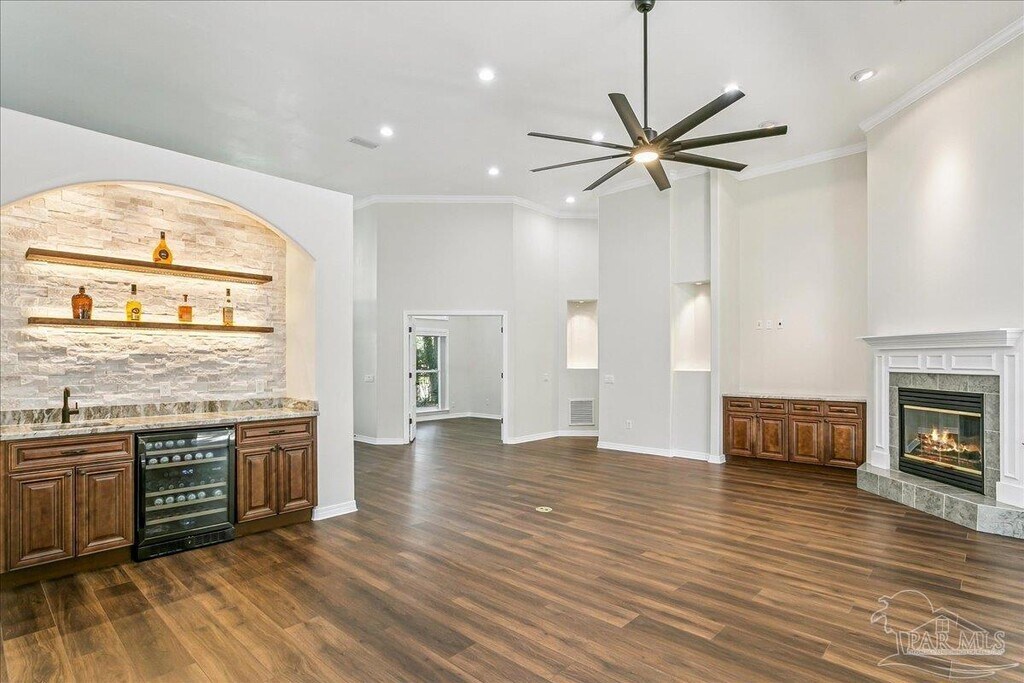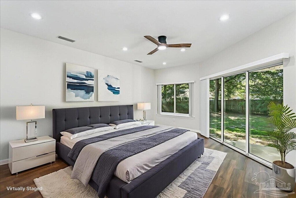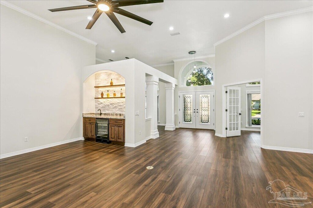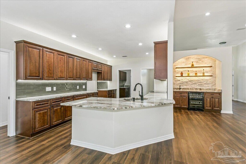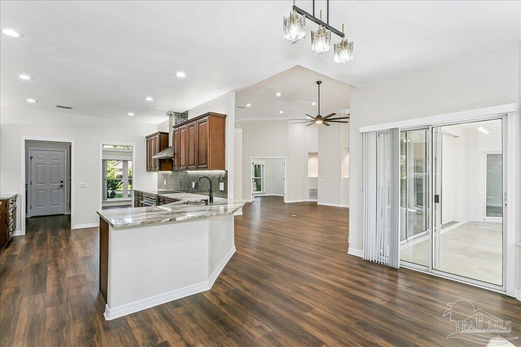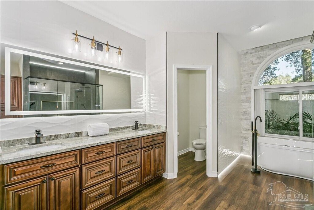 Prepare to be stunned by this immaculate rental home in Pensacola's well loved Marcus Pointe Golf Community. Enjoy the delightful architectural touches including crown molding and arched windows along with 12 ft ceilings. Spacious open concept design is perfect for entertaining with formal dining room,wet bar in the expansive living room with 3 part sliding doors opening to the covered patio. Large chef inspired kitchen complete with 36 inch stainless steel flat top stove,elegant stainless steel hood,durable marble countertops and abundant cabinet space for appliances and cookware. Even more storage and utility sink in the off kitchen laundry/pantry with w/d hookups. Luxuriate in the spa like finishes of the primary bath including fully tiled walls,free standing jetted tub with private garden window for abundant natural light. Oversized walk in shower complete with dual shower heads. Plenty of storage with dual vanity,large built in linen and his & hers walk in closets. The primary bedroom boasts a built in desk and direct access to the delightfully shaded,private backyard. Split floor plan means extra privacy for both Primary and the guest suite located off the kitchen with two large bedrooms joined by an ensuite bath. Walk in shower,dual vanity with lighted mirror and marble backsplash. The backyard offers a peaceful natural landscape with mature oaks,ferns and flowering azaleas. Large two car garage with extra parking pad on driveway. All just a short drive from dinning and shopping in downtown,NAS Pensacola and our famous sugar sand beaches. Contact owner for questions and showing,Five Two Zero 900.2800. Minimum 6 month lease. $40 application fee per applicant.