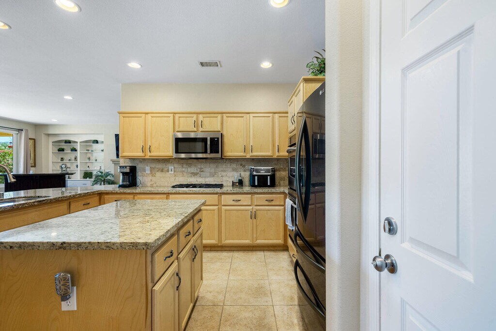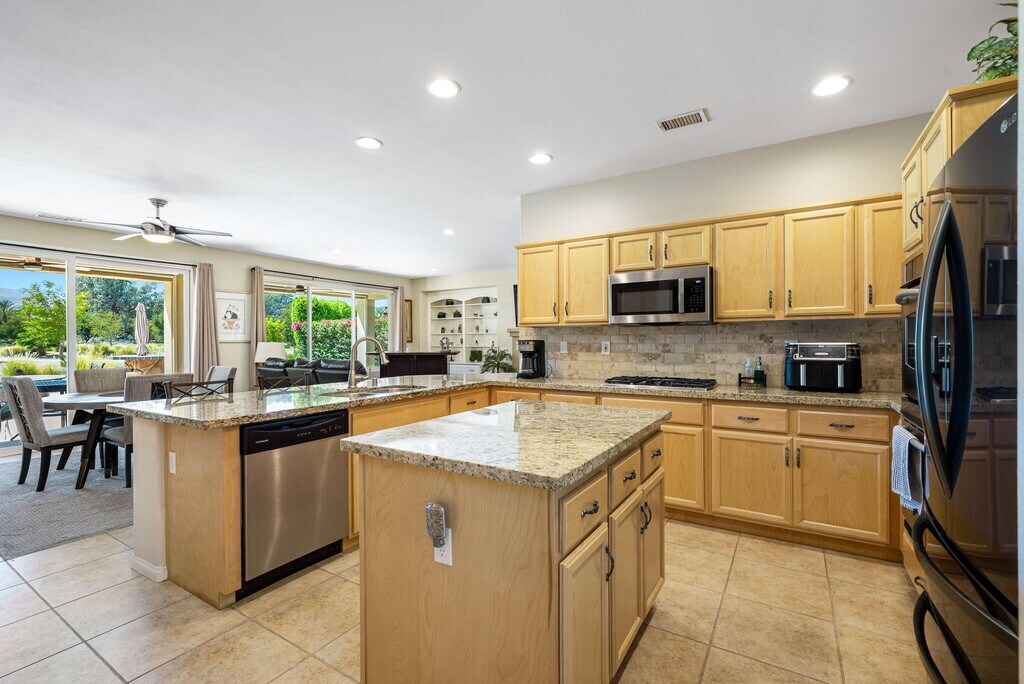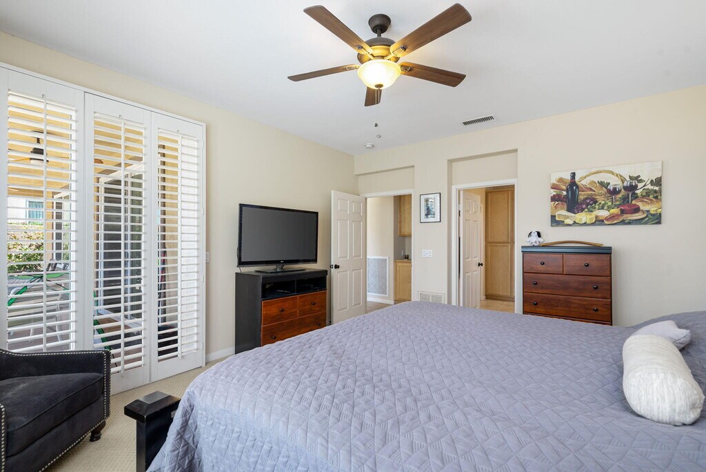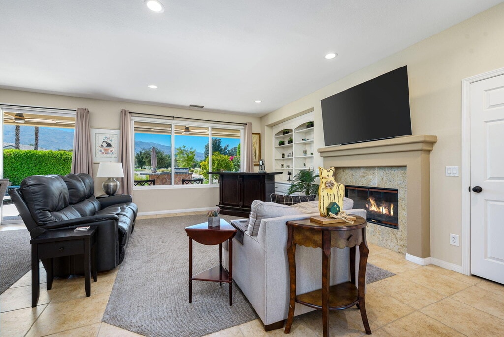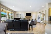 RENTED 2-1-2026 thru 4-30-2026. Welcome to your dream retreat just off the 18th Tee at Trilogy La Quinta! This stunning west-facing oasis,complete with a charming Casita,offers a resort-style backyard that's perfect for entertaining or relaxing. Picture yourself unwinding in the pebble-finished spa,enjoying the tranquil sound of the rock waterfall,or grilling up a feast at the fully equipped BBQ island. With panoramic views of the mountains,lake,and golf course,your evenings on the shaded patio will be nothing short of magical. Step inside this 1,806-square-foot single-level gem to find three spacious bedrooms,three luxurious baths,and a great room designed for comfort with a cozy tile-encased fireplace and custom built-ins. Recently updated flooring throughout the home. The primary suite is your personal sanctuary,featuring plantation shutters,private patio access,a walk-in closet,and a spa-like en suite bath. The gourmet island kitchen,open to the dining room,boasts granite countertops,a custom backsplash,stainless steel appliances,double ovens,and ample cabinetryeverything a chef could desire. The attached Casita,with elegant wood flooring,provides the perfect haven for guests,ensuring comfort and privacy. An extended 2-car garage,all new Milgard windows,upgraded carpets,ceiling fans,and automatic sunshades complete the package,making this home a perfect blend of luxury and functionality.