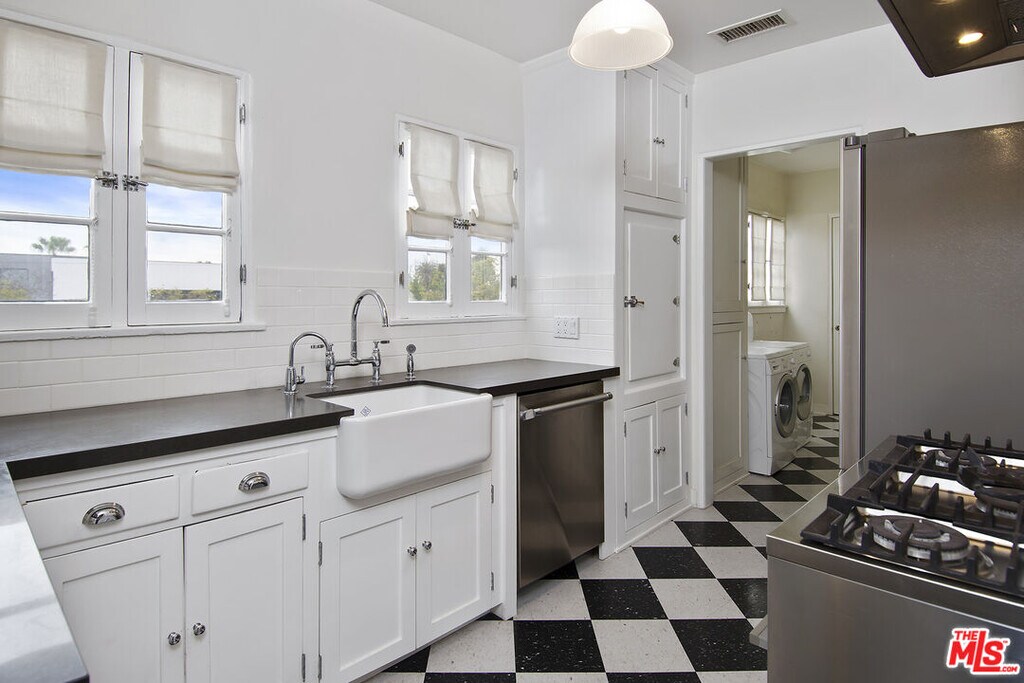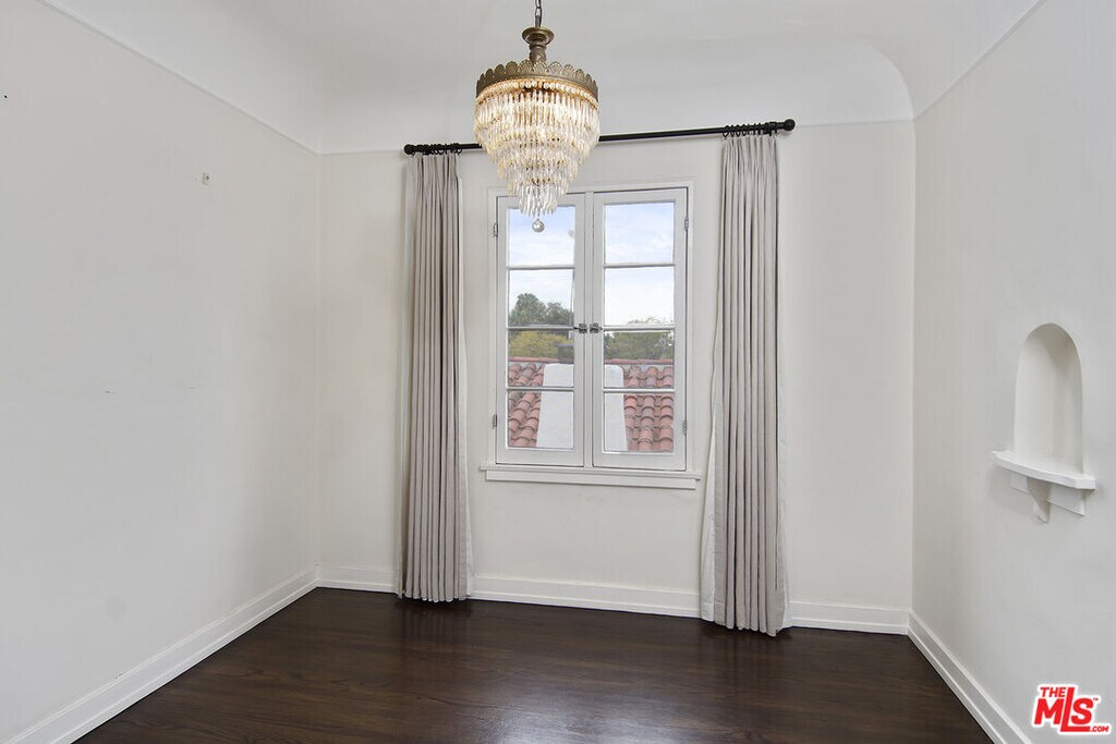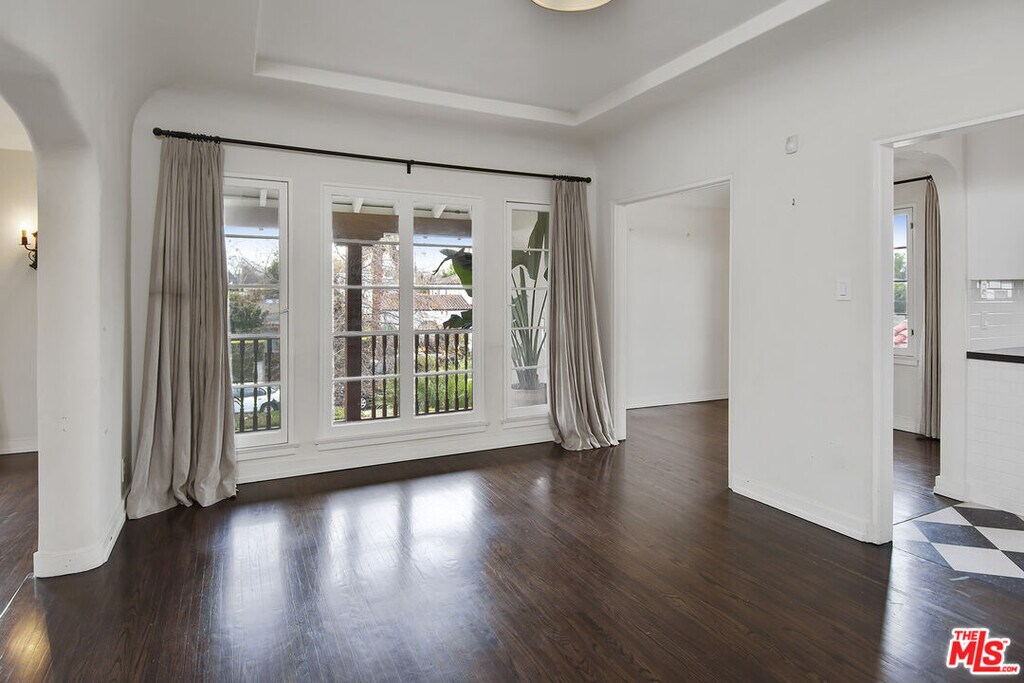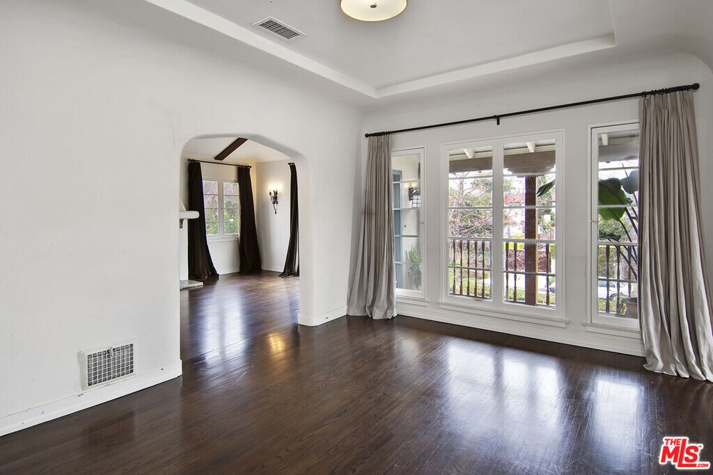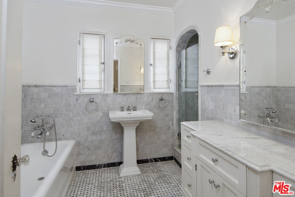 Light and bright Upper unit, in a charming Spanish duplex. Formal living room features original Batchelder fireplace, hardwood floors , and beamed ceilings. Formal dining room, separate breakfast room and updated kitchen with stainless steel appliances. Carrera marble tiled bathroom with separate tub and shower with bench. Laundry room with washer/dryer located inside unit. Central HVAC and available alarm. Gated drive with two car garage. Stunning backyard Minutes to Melrose, Beverly Blvd, Robertson and the Sunset Strip. MLS# 25608203