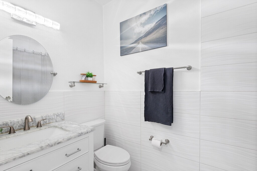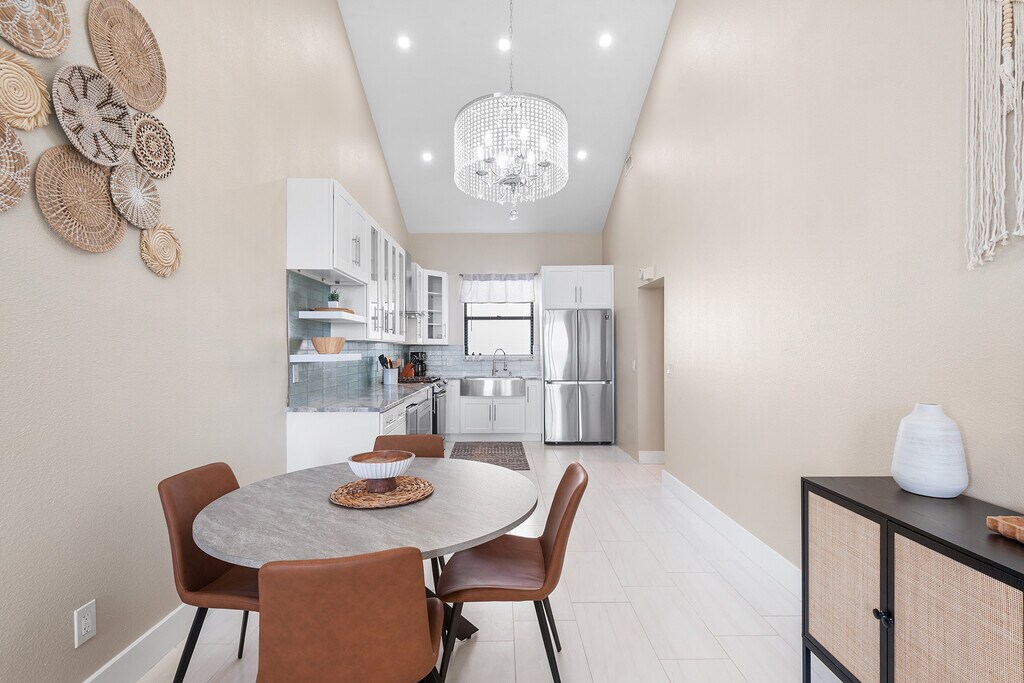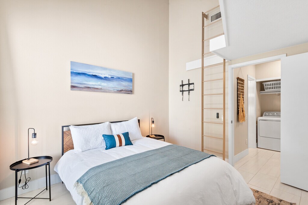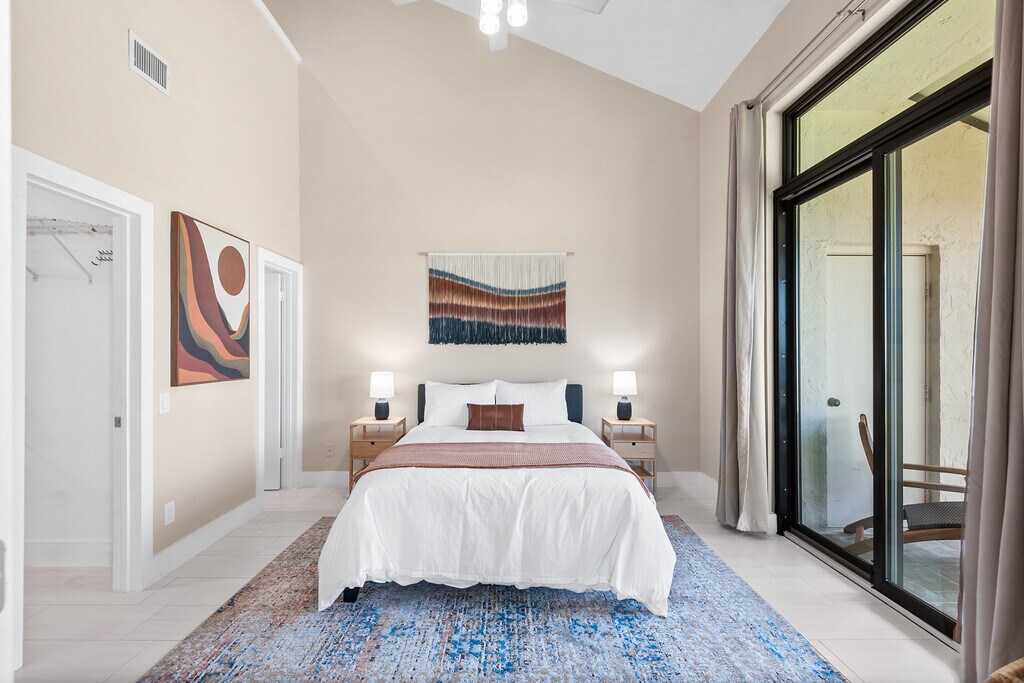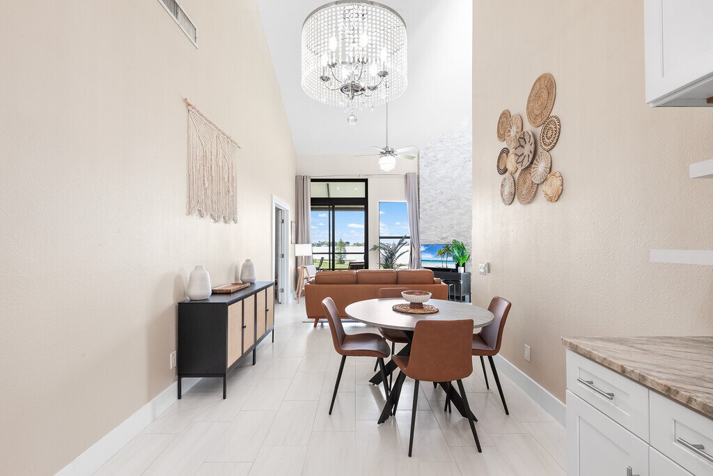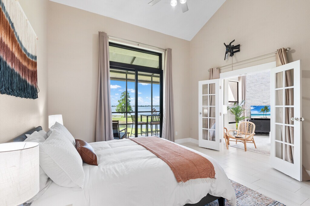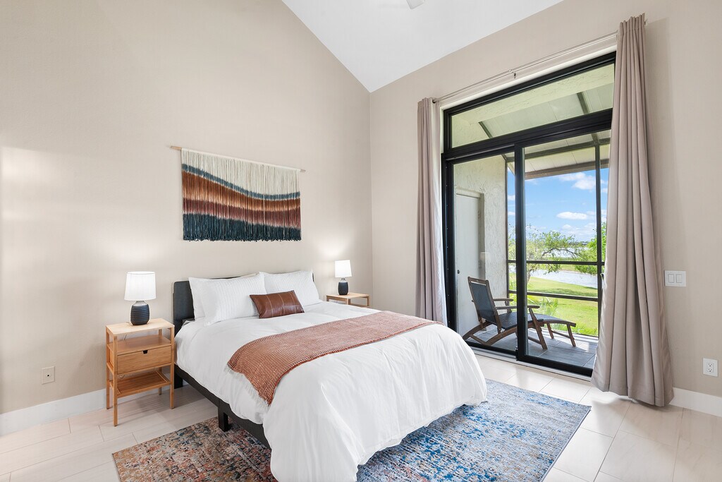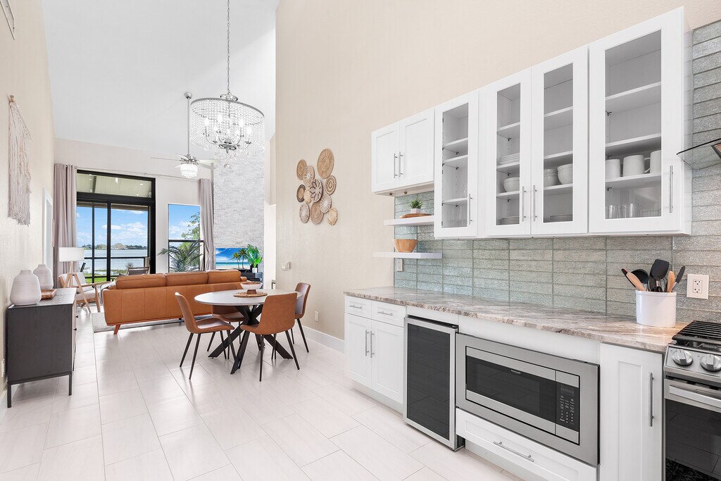 This beautiful 2 bed 2 bath fully furnished condo is located in the gated community of Winterset and boasts spectacular views of lake Winterset and the Legoland fireworks. This fully renovated condo is heaped in upgrades and is move in ready. As you enter the condo via your private entrance you will love the curved steps up to the brand new front door with ring doorbell. As you enter you will immediately notice the modern upgraded tiles throughout the unit, the 5 inch baseboards and amazingly tall ceilings ranging from 12 to 24ft. The glass sliding patio doors from the living area take you onto your private balcony with stunning views of the lake. The balcony also has a good sized storage closet. The living area has a fully functioning wood fireplace with decorative stone. All of the light fixtures have been upgraded and you will see them throughout the unit. The kitchen is a true master piece with white shaker cabinets, granite counter tops, and stainless steel appliances which include a built in wine fridge and microwave. The beautiful glass tile backsplash seamlessly pulls it all together. There are double french doors which lead you to the spacious master bedroom. The master bedroom also has sliding patio doors which lead to onto the balcony. The stairs in the master take you to the large loft area which can be used as a home office or work out area. This has been fitted out with vinyl plank flooring. The master bathroom has been upgraded with a modern vanity with his and her sinks and a walk in shower. The master closet is huge and has plenty of shelves for hanging clothes or storage. The 2nd bedroom is also very spacious with double closets and a large storage area overhead. The hall bathroom comes with a tub with overhead shower, new tiles, a single vanity and beautiful lighting. The sought-after community of Winterset is strategically positioned off Cypress Gardens Blvd., providing easy access to amenities such as Publix grocery, Walmart, Legoland, shopping outlets, dining options, and medical facilities. If you are looking for a fully upgraded condo with amazing views in a popular location this is it! Available 6/1/26 thru (open). Owner pays for garbage and WIFI. Tenant pays electric, water and gas, which is approximately $200-$250/month. No pets