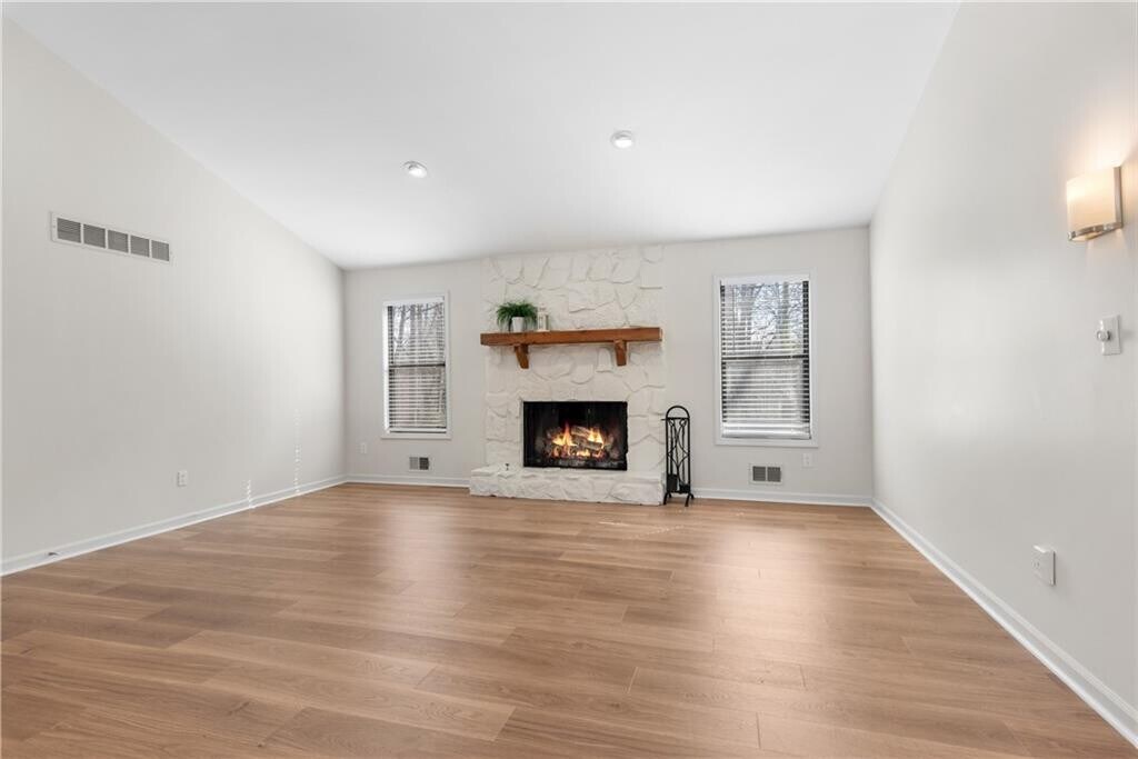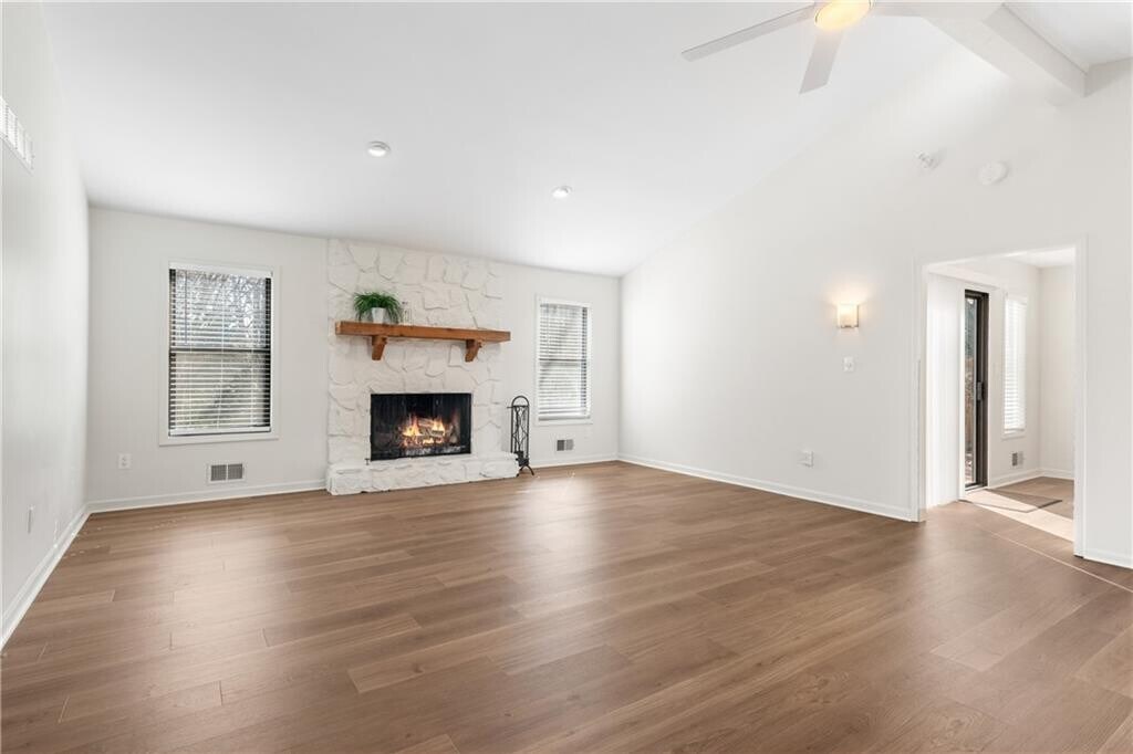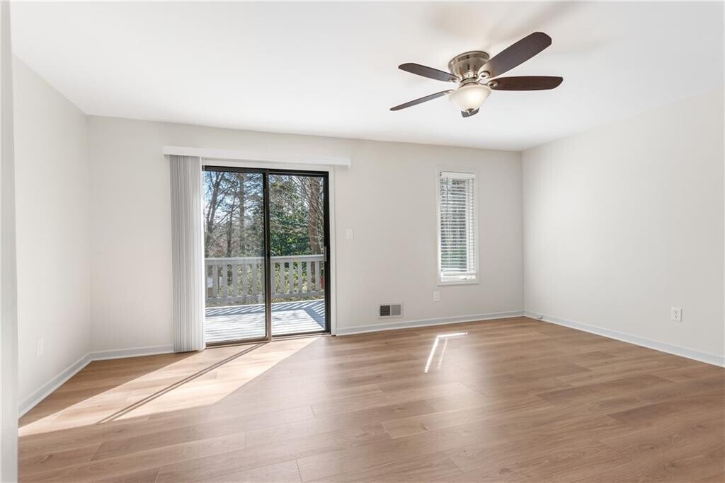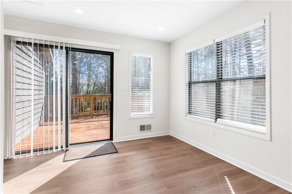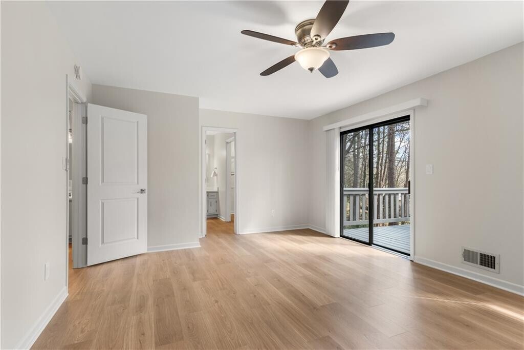 Renovated & Private Near Downtown Woodstock! Enjoy easy living in this freshly updated home featuring a sun-filled vaulted Great Room and a Eat-in Kitchen with stainless appliances. Recent Upgrades: New interior paint (including closets!),interior doors,flooring,Kitchen deck and side-yard privacy fence,blinds,canned lighting,painted cabinets and vanities,smoke and carbon monoxide detectors,insulated garage doors,and water heater. Outdoor Oasis: Sloped driveway leads to large,level,professionally landscaped park-like yard (bi-monthly maintenance available for $150 per month if you crave easy living). Spacious Primary Bedroom with private Deck and two additional Bedrooms share the Hall Bath. Parking & Storage: Massive garage space with epoxy floors—fits up to 4 cars with extra room for a workshop,craft area and laundry. Location: Minutes from the vibrant shops and dining of Downtown Woodstock and near Dupree Park. Small 35 lb dogs accepted on a case by case basis with pet deposit and monthly fee – no dangerous breeds. Please,due to allergies,no smoking or cats permitted. Agents are licensed Real Estate Agents in the State of Georgia and are acting as principles. MLS ID 7731795