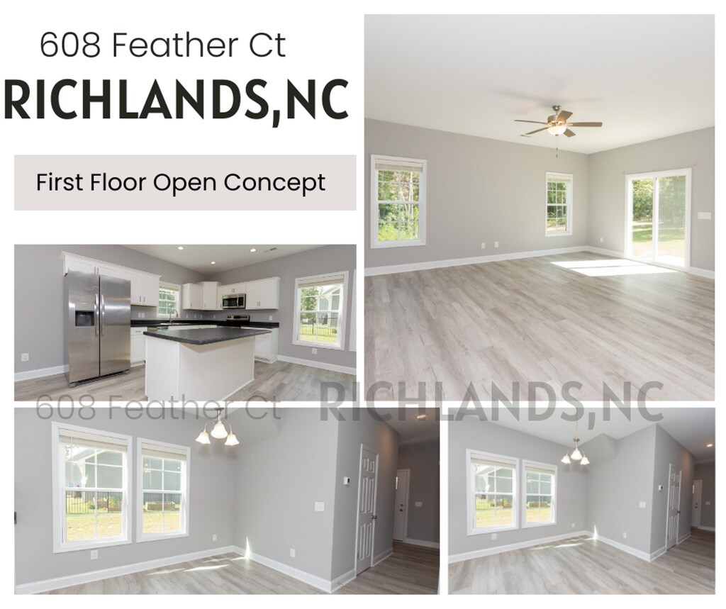 Welcome to 608 Feather Ct As you arrive at this charming residence, you'll be greeted by a covered porch that leads you into a foyer and an inviting open-concept living space to call home. The **LVP flooring** on the main levels makes cleanup effortless. The open concept living on the first floor,, dining, and kitchen areas are a dream for those who love to entertain, creating a seamless flow throughout. The kitchen is equipped with modern stainless-steel appliances, ready to inspire your inner chef. Upstairs you will find 2 guest bedrooms a guest bathroom and a primary bedroom with so much space you could have a home office in their as well. No shortage of closet space in this massive closet. The primary bedroom is completed with a large ensuite Nestled on a generous lot of over **1 acre**, there is plenty of outdoor space for gardening and cook-outs. The property is conveniently located just minutes from the airport, making travel a breeze. The home also features a covered front porch, ideal for enjoying the outdoors in any weather. Situated on a **cul-de-sac lot**, this residence provides a sense of community while maintaining your privacy. Pets are negotiable Don't miss the opportunity to discover this upcoming gem in Richlands, NC.