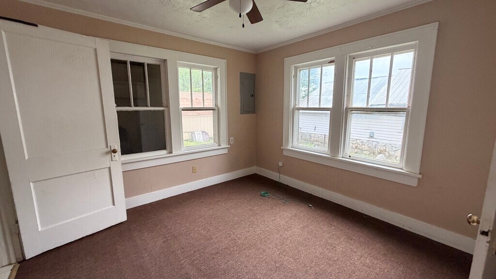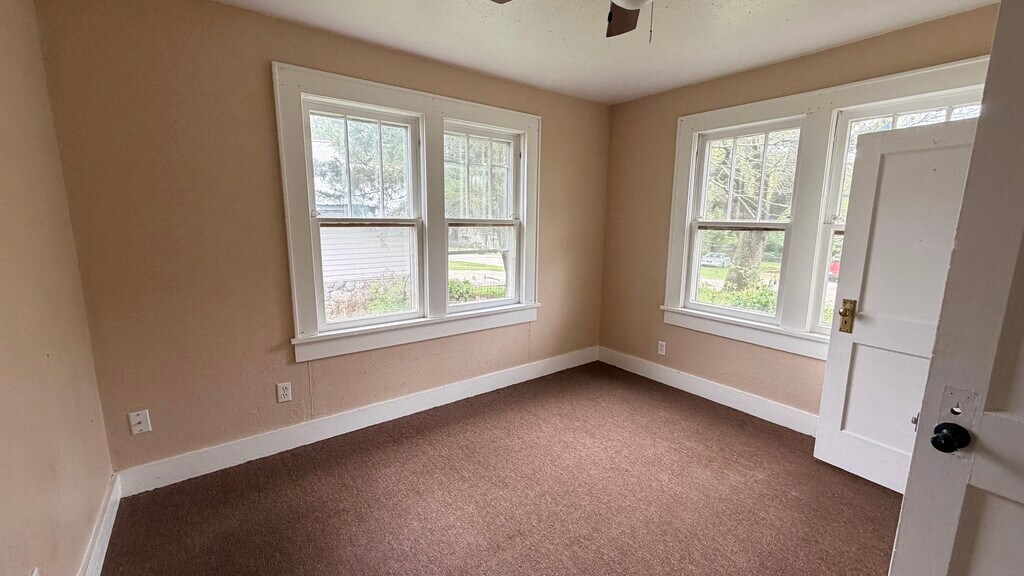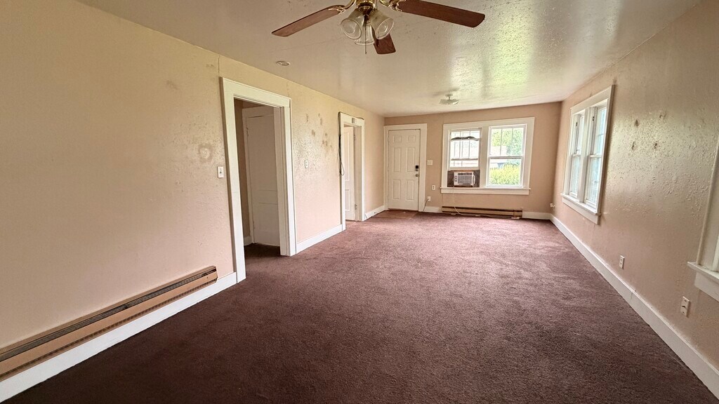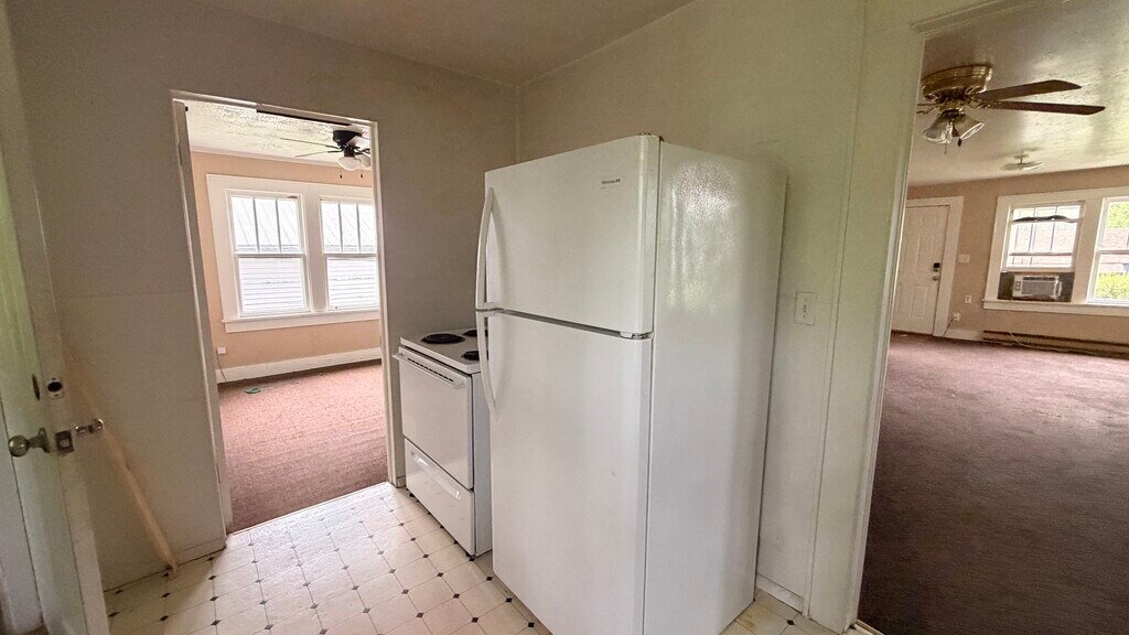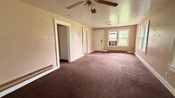 This 2-bedroom, 1-bath home at 609 N Oklahoma features a large front living room with multiple windows and a ceiling fan. The home has a split layout with bedrooms located off the main living area. Each bedroom includes closet space, and the bathroom is positioned off the hallway with a tub/shower combination.The kitchen is equipped with a refrigerator and range, with cabinet and counter space along the walls and an adjacent area for dining. Flooring throughout the home includes carpet in the living areas and bedrooms and vinyl in the kitchen. The property includes baseboard heating, a covered front porch, and a yard area.