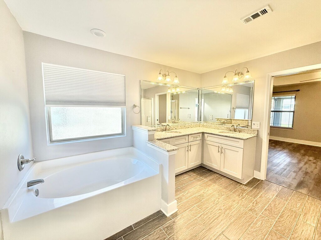 View In 3D: This spacious open-concept home offers 1,980 square feet of beautifully designed living space with luxury vinyl plank flooring throughout for a seamless, modern look. A striking brick archway leads from the living room into the kitchen, adding character and architectural charm. The kitchen is generously sized and features a center island, granite countertops, ample white cabinetry, a dual-basin undermount sink, and stainless steel appliances including a double-door refrigerator, flat-top range/oven, built-in microwave, and dishwasher. The primary suite is a true retreat, showcasing a beautiful tray ceiling with ceiling fan, a large walk-in closet, and an ensuite bath with dual L-shaped vanities, a relaxing garden tub, separate standing shower, and private water closet. Two additional bedrooms share a second full bath with a single vanity and tub/shower combo. Additional highlights include a dedicated laundry room with space for a full-size washer and dryer, a large screened-in back porch with ceiling fan, a spacious fully-fenced backyard with storage shed, and a covered front porch.