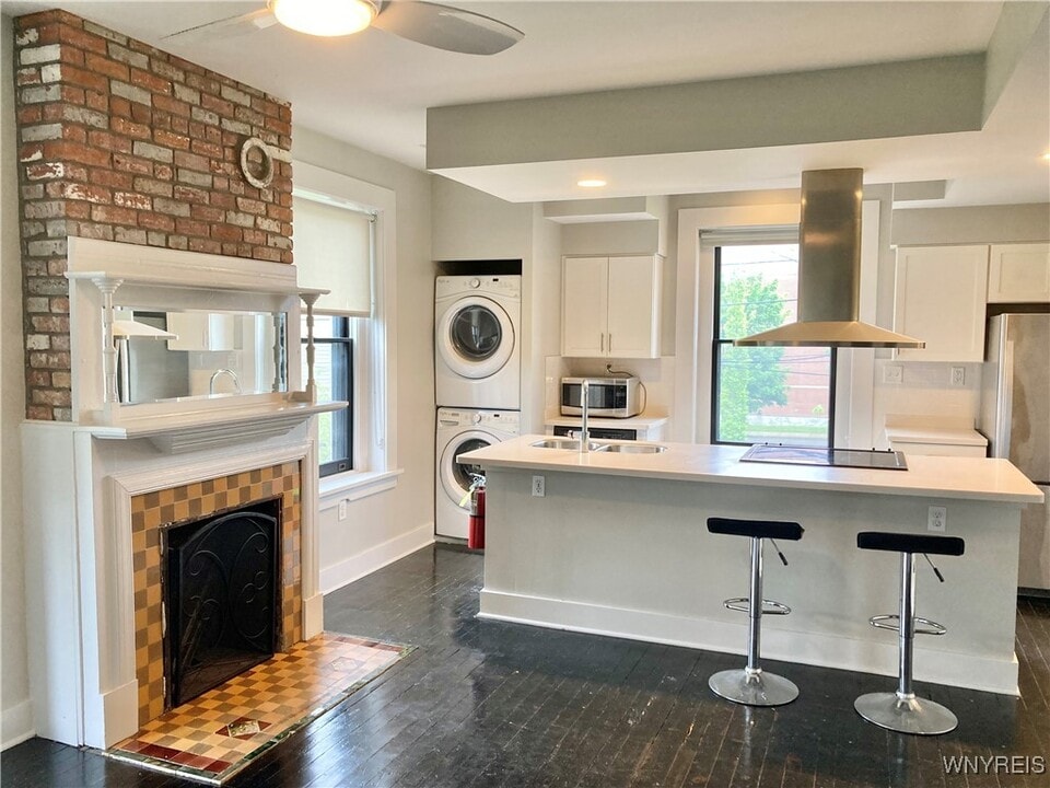 Bright,open 1 BR apartment on the 3rd floor of a classic,Buffalo Victorian,beautifully updated. Hardwood floors,exposed brick,solid surface countertops,Central A/C,tiled shower,free shared laundry in the Basement,a common workout room,and designated off-street parking all combine creating a cool,contemporary space. The building is located a few blocks from Downtown; Allentown and the Medical Campus a short distance away. No smoking; small pet allowed.