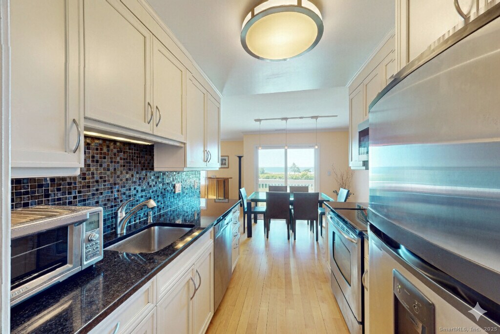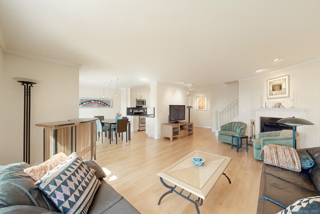 Call for Availability - Shippan Point home has sparkling water views over Long Island Sound! Welcome to your seaside escape located in coveted Marina Bay. This bright and spacious 2-bedroom, 2.5-bath duplex condominium is perfectly sited just steps to the beach and minutes to Metro North train and downtown shopping. Designed with an open-floor plan and flooded with natural light, the main level features an updated galley kitchen with granite counters, stainless steel appliances, and custom cabinets. The kitchen flows seamlessly into the dining area, where sliders open onto a private balcony-your perfect venue for relaxing or entertaining with spectacular water views. The adjoining oversized living room has a warming wood fireplace. A tastefully updated powder room and plenty of storage complete the main floor. Upstairs, the serene primary suite offers a luxurious private balcony overlooking Long Island Sound, a spacious layout with a walk-in closet, and a full en-suite bath. The second bedroom is filled with natural light and features custom closets, making it perfect as a guest room, home office, or both. A second full bath, laundry, and central vacuum are conveniently located on this level as well. MLS# 24123117