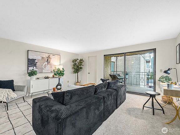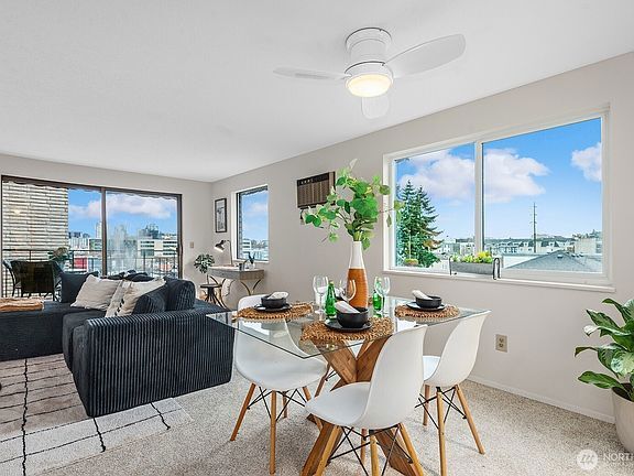 This spacious home has a large living room & dining area plus great city views from every room. The open-area floor plan allows for a desk & chair also w/a great view. The view shown is from the unit itself w/a sliding glass door to the deck & a wall of western windows for exceptional city, Space Needle & Seattle Center vistas. The galley kitchen has all new appliance (all appliances included). There is room here to please the chef with cupboards over & cabinets under. There are two open shelves in the kitchen to display your nicest dishes or for cooking items you may want at hand. The bedroom has room for a king or queen bed w/room for two nightstands. There is room for a reading corner. Amazing access to downtown, garage parking too.