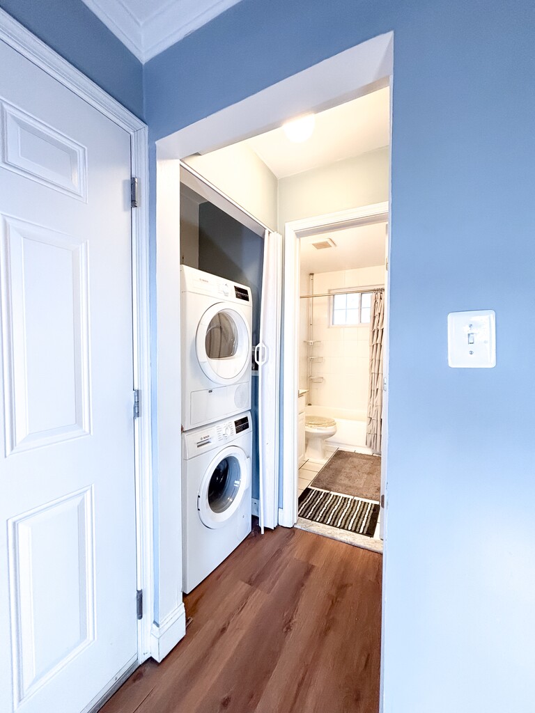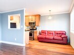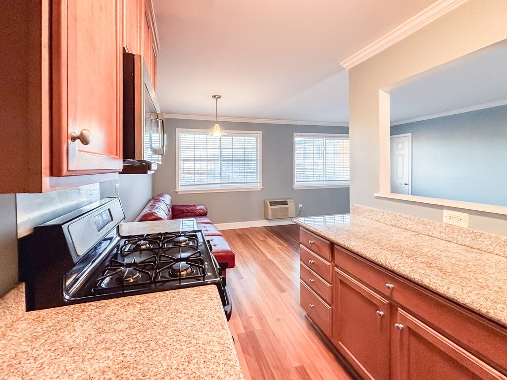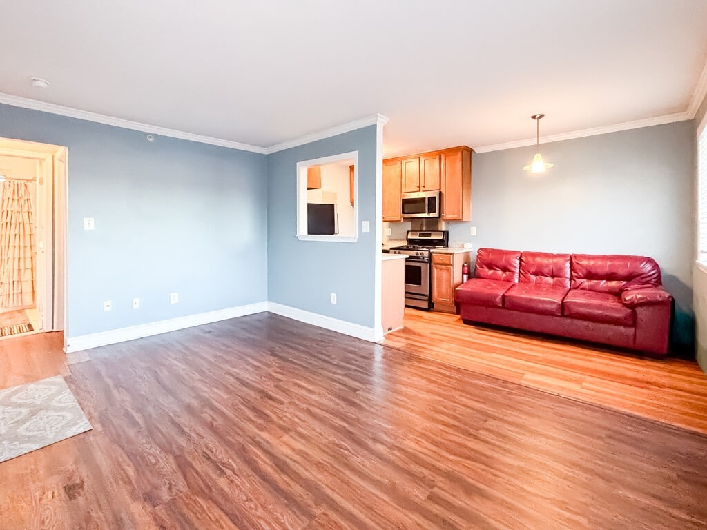 Nice condo unit in the heart of main street Laurel. The unit includes a spacious living room, a kitchen with granite countertops and modern appliances, and a washer and dryer.