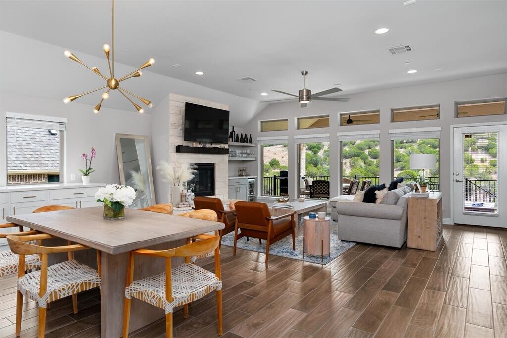 INCLUDED: Refrigerator, Washer, Dryer, wine fridge, patio grill, patio furniture and fire-pit, patio TV & speaker system. This stunning modern farmhouse showcases breathtaking, panoramic views of the hill country. Every corner of the home is filled with natural light, thanks to large windows and high ceilings that create an open, airy feel. From the living area to the owner’s suite, you'll enjoy gorgeous hill country views that make this home truly one-of-a-kind. Start your mornings on the back patio with one of the best greenbelt views in Sweetwater. The kitchen is a chef’s paradise, with ample space for both cooking and entertaining. A second wall of counters and storage adds extra functionality, while the stainless steel appliances and a 36†5-burner gas cooktop make cooking a breeze. A custom-built bar and wine fridge complete the space, while the warm golden accents in the hardware and modern chandelier elevate the entire look. The spacious kitchen island not only serves as a striking centerpiece but also offers plenty of storage. The back patio is an entertainer's dream, featuring outdoor speakers, a gas grill, and a hookup for a TV, making it ideal for hosting gatherings. Home is also equipped with a Tesla EV charger, offering added convenience for electric vehicle owners. As part of the exclusive Sweetwater community, residents have access to top-tier amenities, including two clubhouses, three pools, a splash pad, fitness center, playgrounds, a dog park, miles of biking and hiking trails, basketball courts, and a soccer field. Located just minutes from Lake Travis, the Hill Country Galleria, and numerous dining and shopping options, plus only 18 miles to Downtown Austin. Top-rated Lake Travis ISD schools make this location even more desirable! MLS ID 3625864